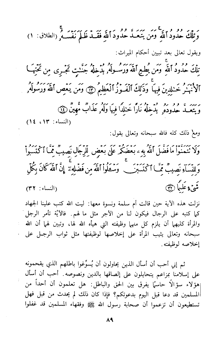 {تِلْكَ حُدُودُ اللَّهِ وَمَنْ يُطِعِ اللَّهَ وَرَسُولَهُ يُدْخِلْهُ جَنَّاتٍ تَجْرِي مِنْ تَحْتِهَا الْأَنْهَارُ خَالِدِينَ فِيهَا وَذَلِكَ الْفَوْزُ الْعَظِيمُ (13) وَمَنْ يَعْصِ اللَّهَ وَرَسُولَهُ وَيَتَعَدَّ حُدُودَهُ يُدْخِلْهُ نَارًا خَالِدًا فِيهَا وَلَهُ عَذَابٌ مُهِينٌ (14)} (النساء: 13، 14)