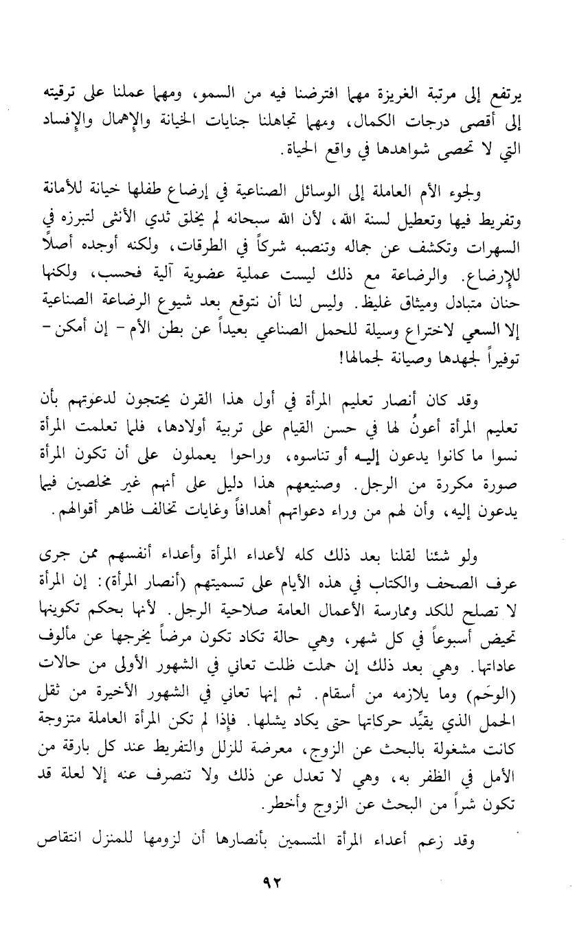 ولجوء الأم العاملة إلى الوسائل الصناعية في إرضاع طفلها خيانة للأمانة وتفريط فيها وتعطيل لسنة الله, لأن الله سبحانه لم يخلق ثدي الأنثى لتبرزه في السهرات وتكشف عن جماله وتنصبه شركاً في الطرقات، ولكنه أوجده أصلاً للإِرضاع. والرضاعة مع ذلك ليست عملية عضوية آلية فحسب، ولكنها حنان متبادل وميثاق غليظ. وليس لنا أن نتوقع بعد شيوع الرضاعة الصناعية إلا السعي لاختراع وسيلة للحمل الصناعي بعيداً عن بطن الأم - إن أمكن - توفيراً لجهدها وصيانة لجمالها!