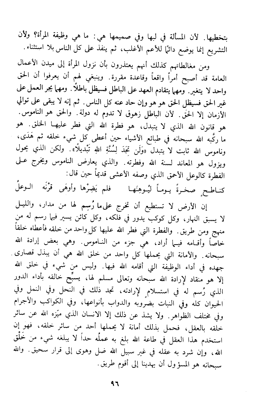 ومن مغالطاتهم كذلك أنهم يعتذرون بأن نزول المرأة إلى ميدن الأعمال العامة قد أصبح أمراً واقعاً وقاعدة مقررة. وينبغي لهم أن يعرفوا أن الحق واحد لا يتغير. ومهما يتقادم العهد على الباطل فسيظل باطلاً. ومهما يجر العمل على غير الحق فسيظل الحق هو هو وإن حاد عنه كل الناس. ثم إنه لا يبقى على توالي الأزمان إلا الحق. لأن الباطل زهوق لا تدوم له دولة. والحق هو الناموس. هو قانون الله الذي لا يتبدل، هو فطرة الله التي فطر عليها الخلق. هو ما ركَّبه الله سبحانه في طبائع الأشياء حين أعطى كل شيء خلقه ثم هَدَى، وناموس الله ثابت لا يتبدل {وَلَنْ تَجِدَ لِسُنَّةِ اللَّهِ تَبْدِيلًا}. ولكن الذي يحول ويزول هو المعاند لسنة الله وفطرتهَ. والذي يعارض الناموس ويخرج على الفطرة كالوعل الأحمق الذي وصفه الأعشى قديماً حين قال: