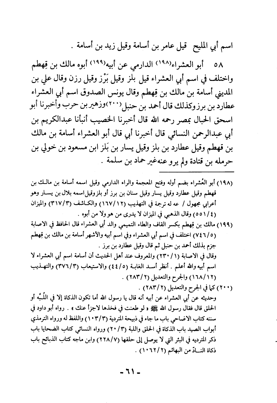 58 - أَبُو العشراء الدَّارمِيّ عَن أَبِيه أَبوهُ مَالك بن قهطم وَاخْتلف فِي اسْم أبي العشراء قيل بلز وَقيل برز وَقيل رزن وَقَالَ عَليّ بن الْمَدِينِيّ أُسَامَة بن مَالك بن قهطم وَقَالَ يُونُس الصدوق اسْم أبي العشراء عُطَارِد بن برز وَكَذَلِكَ قَالَ أَحْمد بن حَنْبَل وَزُهَيْر بن حَرْب وَأخْبرنَا أَبُو إِسْحَق الحبال بِمصْر رَحمَه الله قَالَ أخبرنَا الخصيب أَنبأَنَا عبد الكريم بن أبي عبد الرحمن النَّسَائِيّ قَالَ أخبرنَا أبي قَالَ أَبُو العشراء أُسَامَة بن مَالك بن قهطم وَقيل عُطَارِد ابْن بلز وَقيل يسَار بن بلز ابْن مَسْعُود بن خولي بن حَرْمَلَه بن قَتَادَة وَلم يرو عَنهُ غير حَمَّاد بن سَلمَة