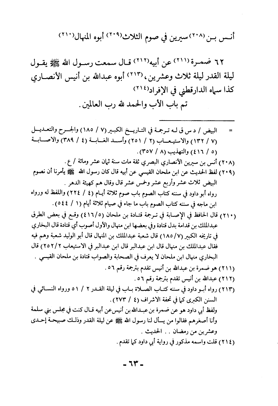 62 - ضَمرَة عَن أَبِيه قَالَ سَمِعت رَسُول الله صلى الله عَلَيْهِ وَسلم يَقُول لَيْلَة الْقدر لَيْلَة ثَلَاث وَعشْرين أَبوهُ عبد الله بن أنيس الْأنْصَارِيّ كَذَا سَمَّاهُ الدَّارَقُطْنِيّ فِي الْإِفْرَاد تمّ بَاب الْأَب وَالْحَمْد لله رب الْعَالمين