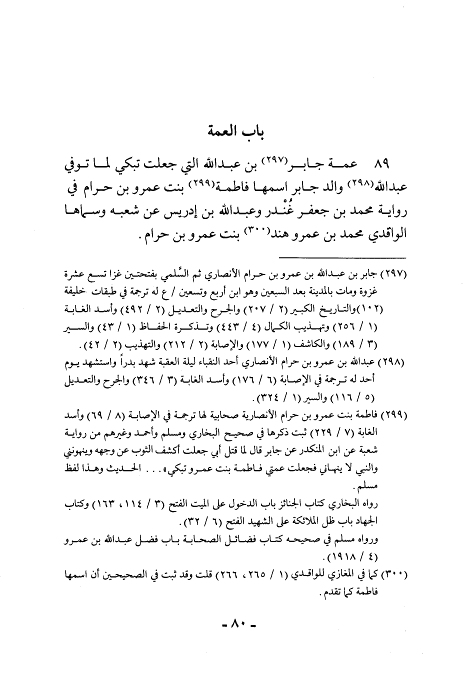 89 - عمَّة جَابر بن عبد الله الَّتِي جعلت تبْكي لما توفّي عبد الله وَالِد جَابر اسْمهَا فَاطِمَة بنت عَمْرو بن حرَام فِي رِوَايَة مُحَمَّد بن جَعْفَر غنْدر وعبد الله ابْن إِدْرِيس عَن شُعْبَة وسماها الْوَاقِدِيّ مُحَمَّد بن عَمْرو هِنْد بنت عَمْرو بن حرَام