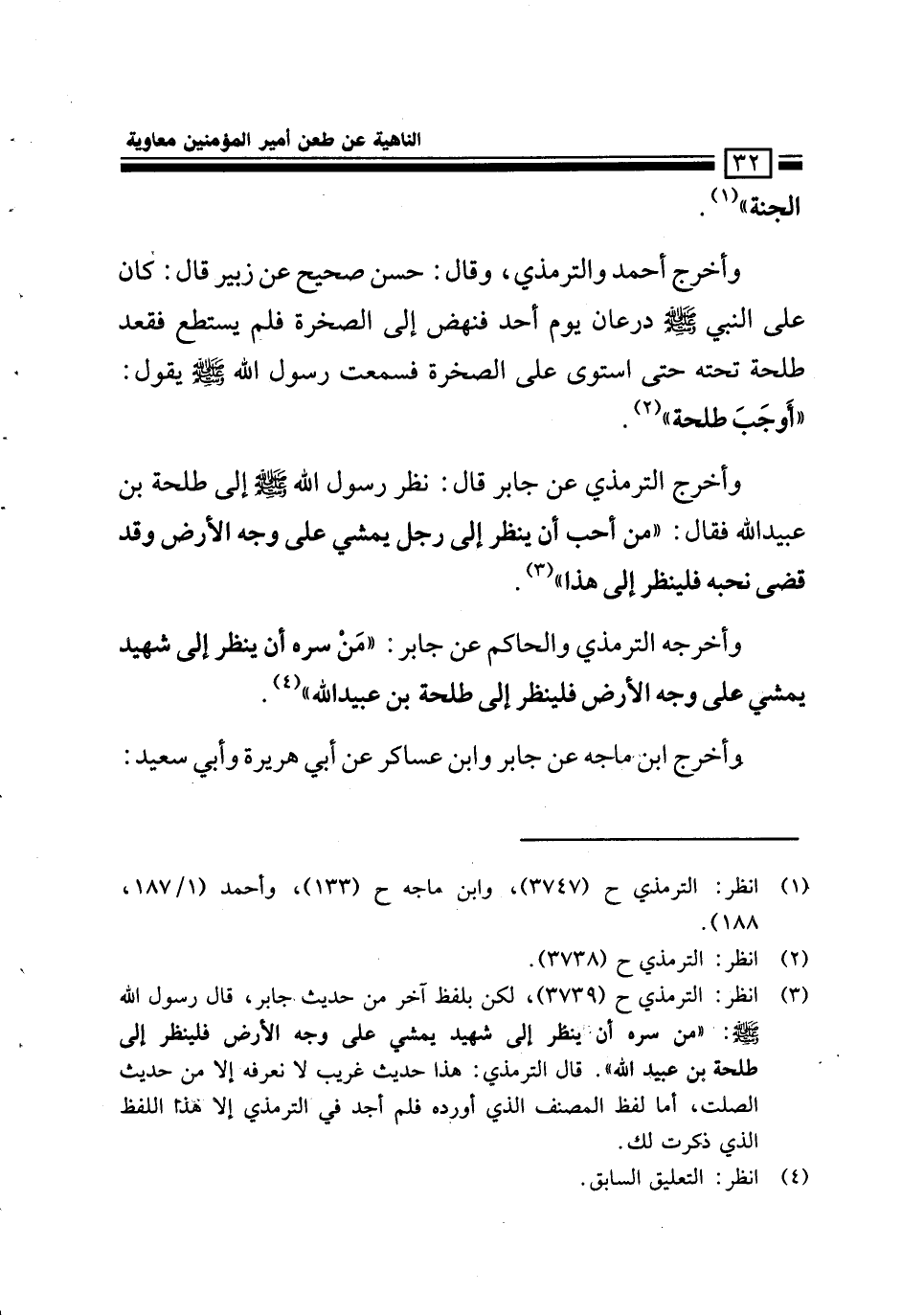 وأخرج الترمذي والحاكم عن جابر: «من سره أن ينظر إلى شهيد يمشي على وجه الأرض فلينظر إلى طلحة بن عبيد الله».