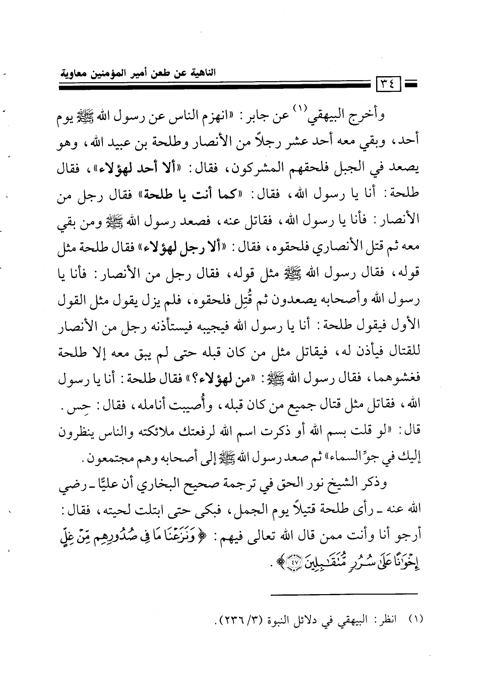 وأخرج البيهقي عن جابر: انهزم الناس عن رسول الله - صلى الله عليه وسلم - يوم أحد وبقي معه أحد عشر رجلا من الأنصار وطلحة بن عبيد الله وهو يصعد في الجبل فلحقهم المشركون فقال: ألا أحد لهؤلاء، فقال طلحة: أنا يا رسول الله فقال: كما أنت يا طلحة فقال رجل من الأنصار فأنا يا رسول الله فقاتل عنه فصعد رسول الله - صلى الله عليه وسلم - ومن بقي معه ثم قتل الأنصاري فلحقوه فقال: ألا رجل لهؤلاء، فقال طلحة مثل قوله فقال رسول الله - صلى الله عليه وسلم - مثل قوله فقال رجل من الأنصار: فأنا يا رسول الله، فأصحابه يصعدون ثم قتل فلحقوه فلم يزل يقول مثل القول الأول فيقول طلحة: أنا يا رسول الله فيجيبه فيستأذنه رجل من الأنصار للقتال فيأذن له فيقاتل مثل من كان قبله حتى لم يبق معه إلا طلحة فغشوهما فقال رسول الله صّلى الله تعالى عليه وسّلم من لهؤلاء فقال طلحة أنا يا رسول الله فقاتل مثل قتال جميع من كان قبله وأصيبت أنامله فقال: حس، قال: لو قلت بسم الله أو ذكرت اسم الله لرفعتك ملائكته والناس ينظرون إليك في جو السماء ثم صعد رسول الله - صلى الله عليه وسلم - إلى أصحابه وهم مجتمعون.
