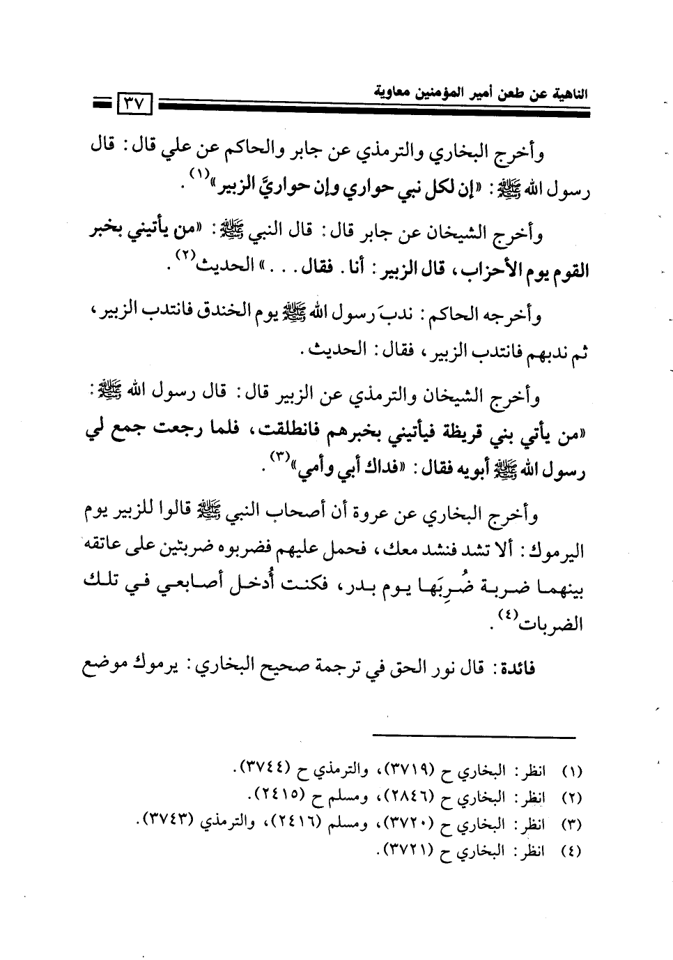 وأخرج البخاري والترمذي عن جابر والحاكم عن علي قالا: قال رسول الله - صلى الله عليه وسلم -: «إن لكل نبي حواري وإن حواريي الزبير». وأخرج الشيخان عن جابر قال: قال النبي - صلى الله عليه وسلم -: «من يأتيني بخبر القوم» يوم الأحزاب، قال الزبير: أنا، فقال .. الحديث. وأخرج الحاكم: ندب رسول الله - صلى الله عليه وسلم -[الناس] يوم الخندق فانتدب الزبير ثم ندبهم فانتدب الزبير فقال .. الحديث.