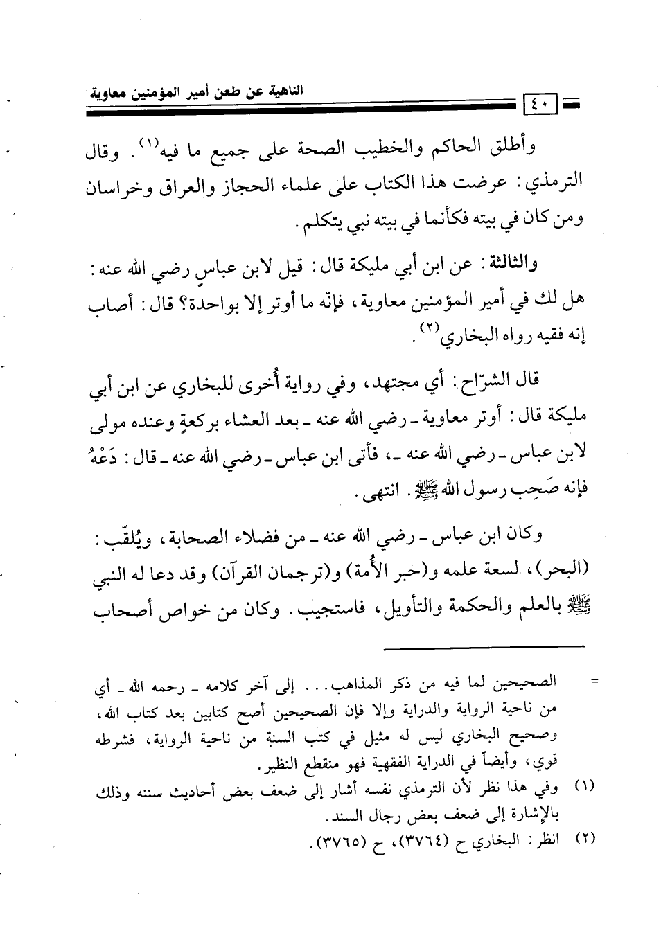 والثالثة عن ابن أبي مليكة قال: قيل لابن عباس رضي الله عنهما: هل لك في أمير المؤمنين معاوية فإنه ما أوتر إلا بواحدة؟ قال: أصاب إنه فقيه. رواه البخاري. قال الشراح: أي مجتهد. وفي رواية أخرى للبخاري عن ابن أبي مليكة قال: أوتر معاوية رضي الله عنه بعد العشاء بركعة وعنده مولى لابن عباس رضي الله عنهما فأتى ابن عباس رضي الله عنهما قال: دعه فإنه صحب رسول الله - صلى الله عليه وسلم -. انتهى.