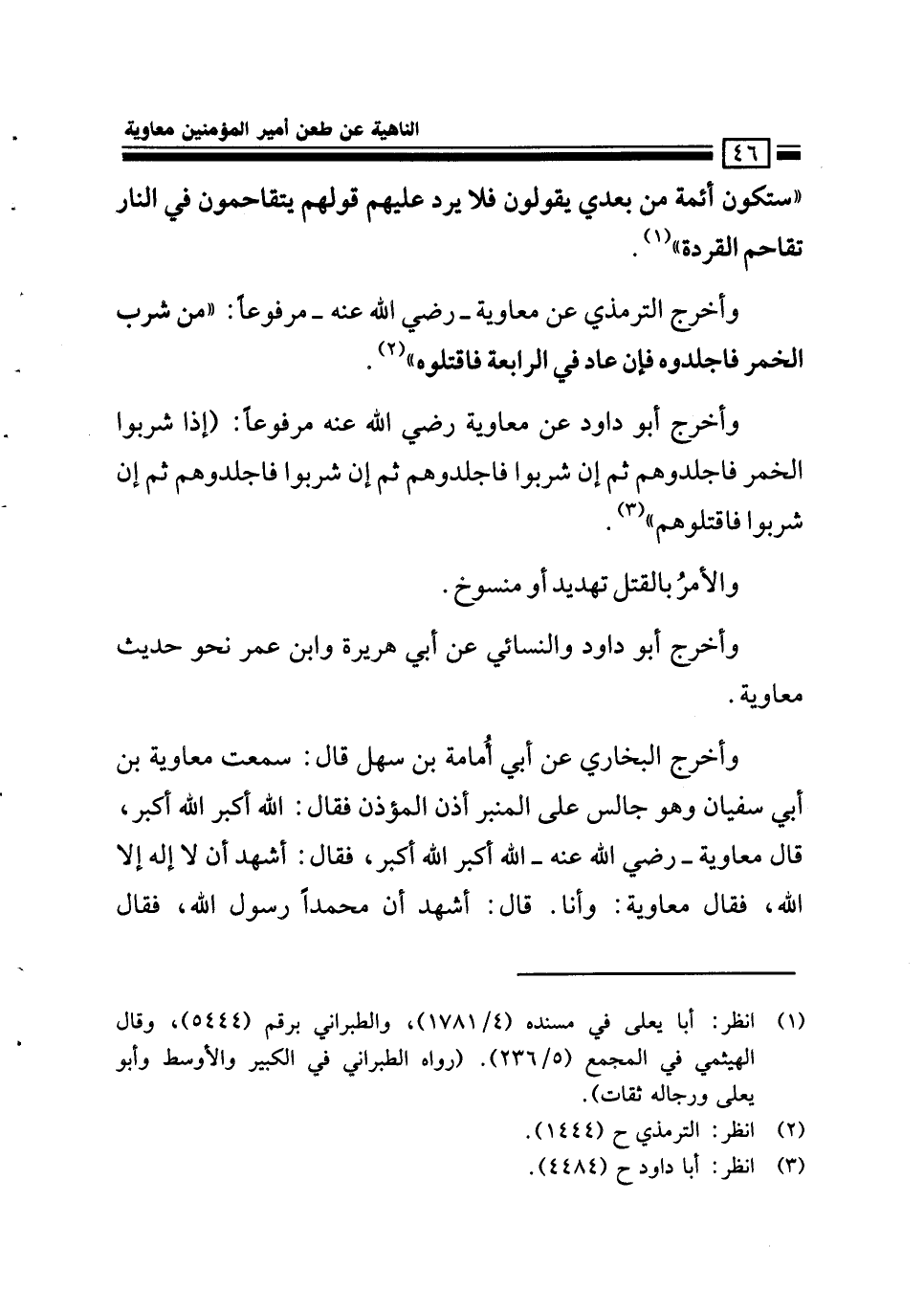 وأخرج الترمذي عن معاوية رضي الله عنه مرفوعا: «من شرب الخمر فاجلدوه فإن عاد في الرابعة فاقتلوه».