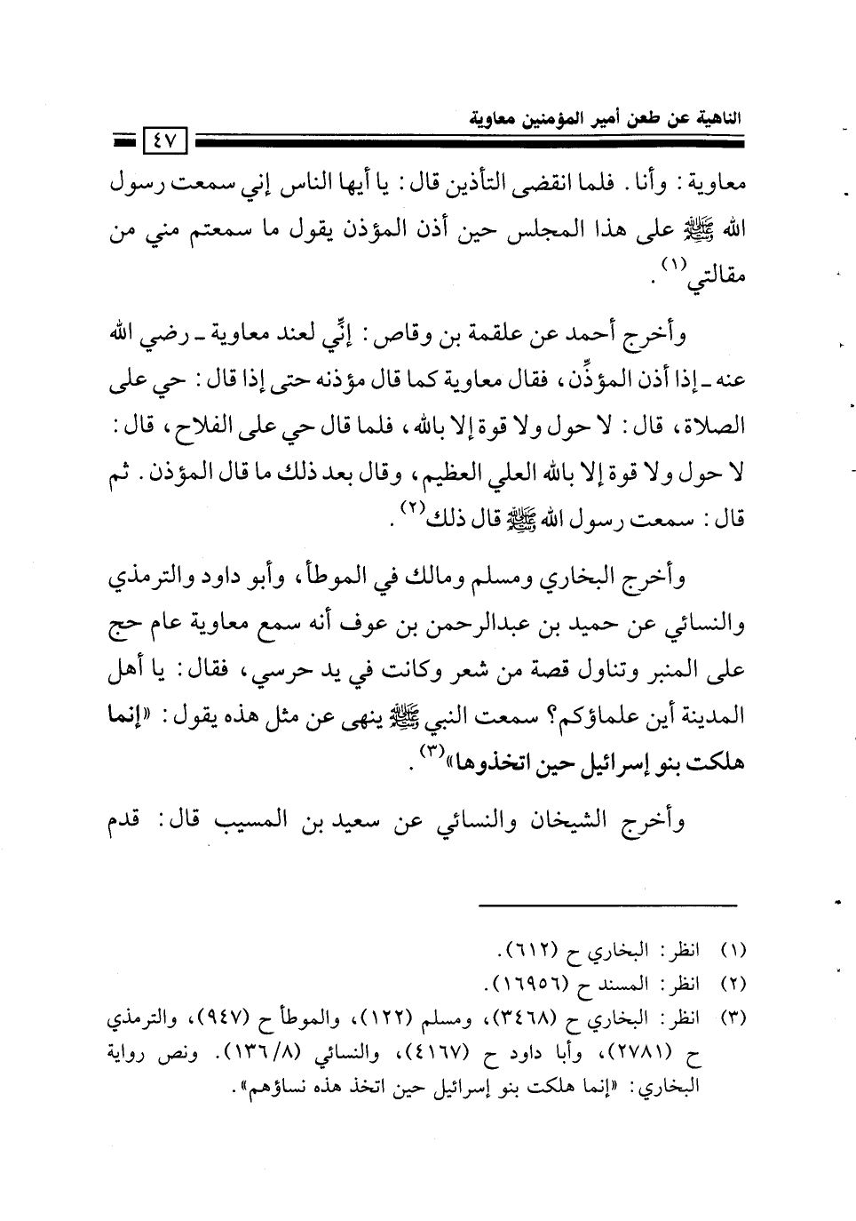 وأخرج أحمد عن علقمة بن أبي وقاص قال: إني لعند معاوية رضي الله عنه إذ أذن المؤذن فقال معاوية كما قال مؤذنه حتى إذا قال: حي على الصلاة قال: «لا حول ولا قوة إلا بالله»، فلما قال: حي على الفلاح، قال: «لا حول ولا قوة إلا بالله العلي العظيم»، وقال بعد ذلك ما قال المؤذن، ثم قال: سمعت رسول الله - صلى الله عليه وسلم - قال ذلك.