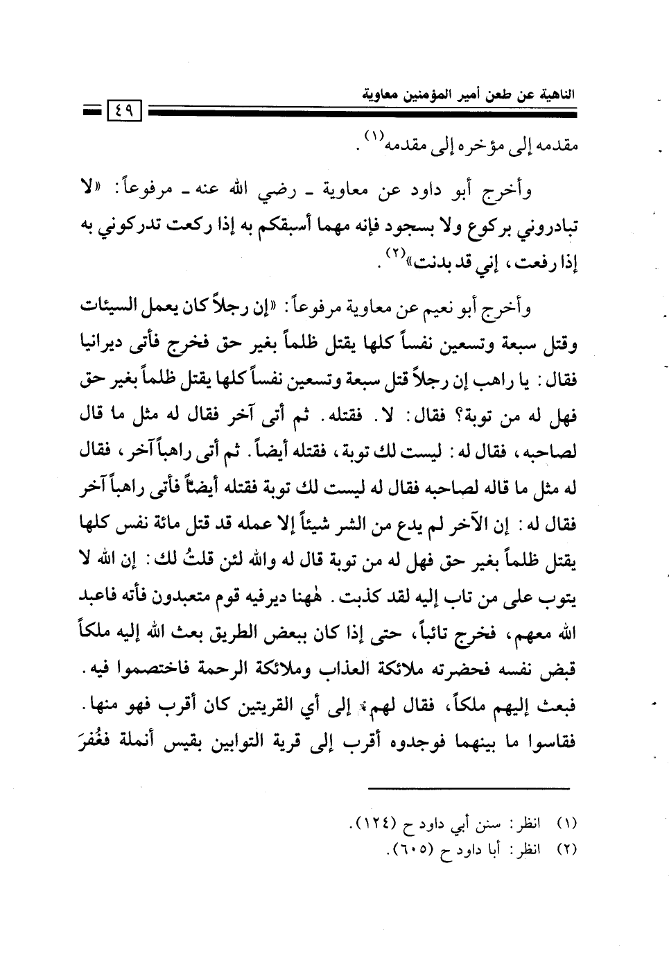 وأخرج أبو نعيم عن معاوية مرفوعا أن رجلا كان يعمل السيآت وقتل سبعة وتسعين نفسا كلها يقتل ظلما بغير حق فخرج فأتى ديرانيا فقال يا راهب إن رجلا قتل سبعة وتسعين نفسا كلها يقتل ظلما بغير حق فهل له من توبة؟ فقال: لا، فقتله ثم أتى آخر فقال له مثل ما قال لصاحبه فقال: ليست له التوبة، فقتله أيضا، ثم أتى راهبا آخر فقال له مثل ما قال لصاحبه فقال له ليست لك توبة، فقتله أيضا فأتى راهبا آخر فقال له: إن الآخر لم يدع من الشر شيئا إلا عمله قد قتل مائة نفس كلها يقتل ظلما بغير حق فهل له من توبة؟ قال له: والله لئن قلت لك إن الله لا يتوب على من تاب إليه لقد كذبت، ههنا دير فيه قوم متعبدون فأته فاعبد الله معهم، فخرج تائبا حتى إذا كان ببعض الطريق بعث الله إليه ملكا قبض نفسه فحضرته ملائكة العذاب وملائكة الرحمة فاختصموا فيه فبعث إليهم ملكا فقال لهم إلى أي القريتين كان أقرب فهو منهما فقاسوا ما بينهما فوجدوه أقرب إلى قرية التوابين بقيس أنملة فغفر