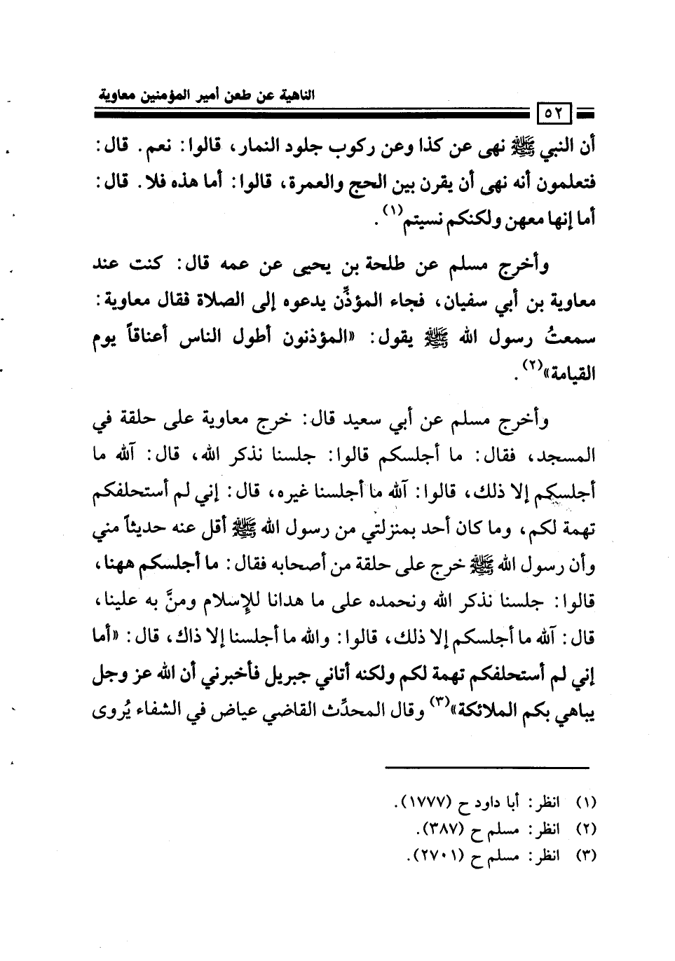وأخرج مسلم عن طلحة بن يحيى عن عمه قال: كنت عند معاوية بن أبي سفيان فجاءه المؤذن يدعوه إلى الصلاة فقال معاوية: سمعت رسول الله - صلى الله عليه وسلم - يقول: «المؤذنون أطول الناس اعناقا يوم القيامة»