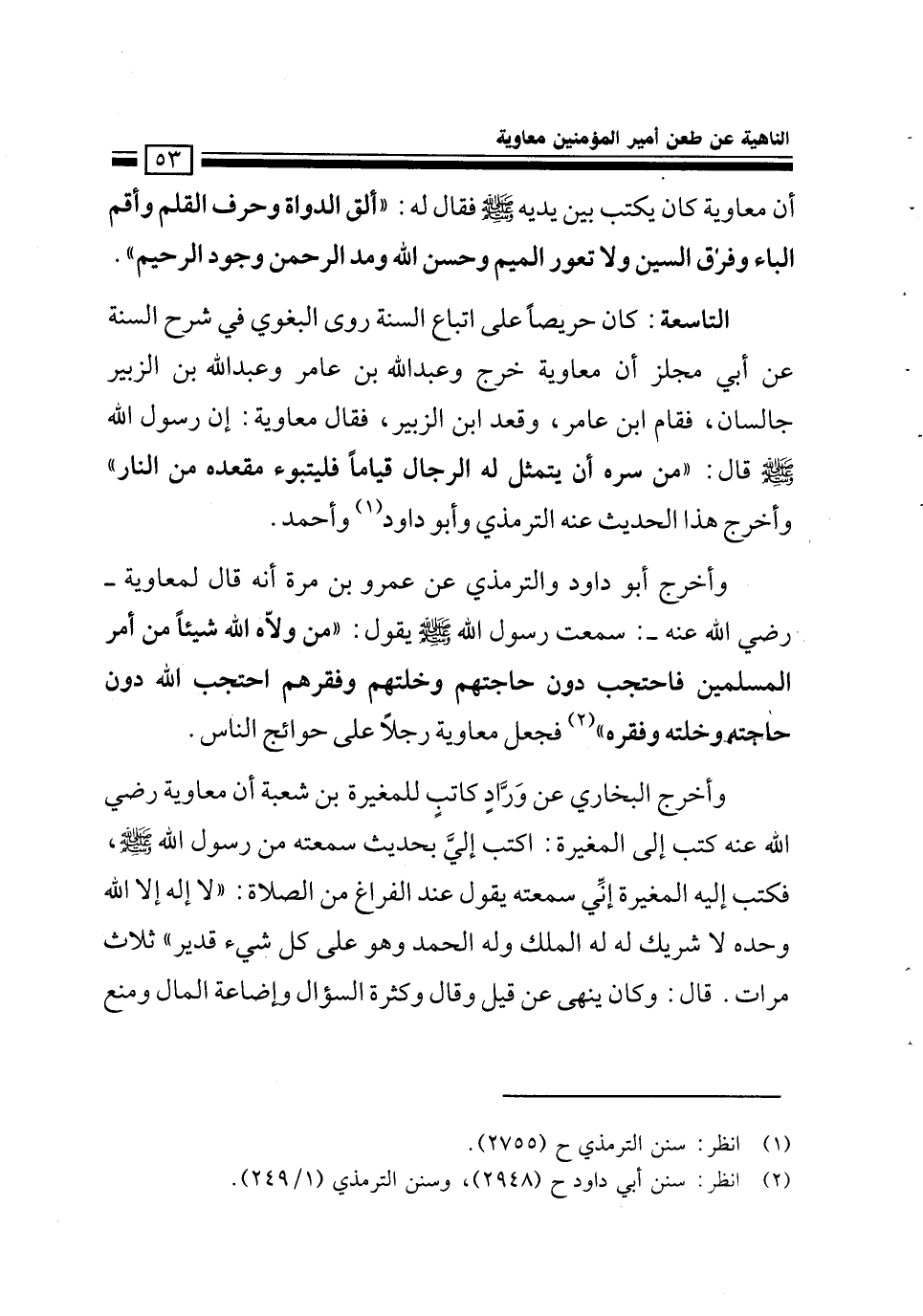 وأخرج البخاري عن ورّاد كاتب المغيرة بن شعبة أن معاوية رضي الله عنه كتب إلى المغيرة: اكتب إلي بحديث سمعت من رسول الله - صلى الله عليه وسلم -، فكتب إليه المغيرة: إني سمعته يقول عند الفراغ من الصلاة: «لا اله إلا الله وحده لا شريك له له الملك وله الحمد وهو على كل شيء قدير» ثلاث مرات، قال: «وكان ينهى عن قيل وقال وكثرة السؤال وإضاعة المال ومنع