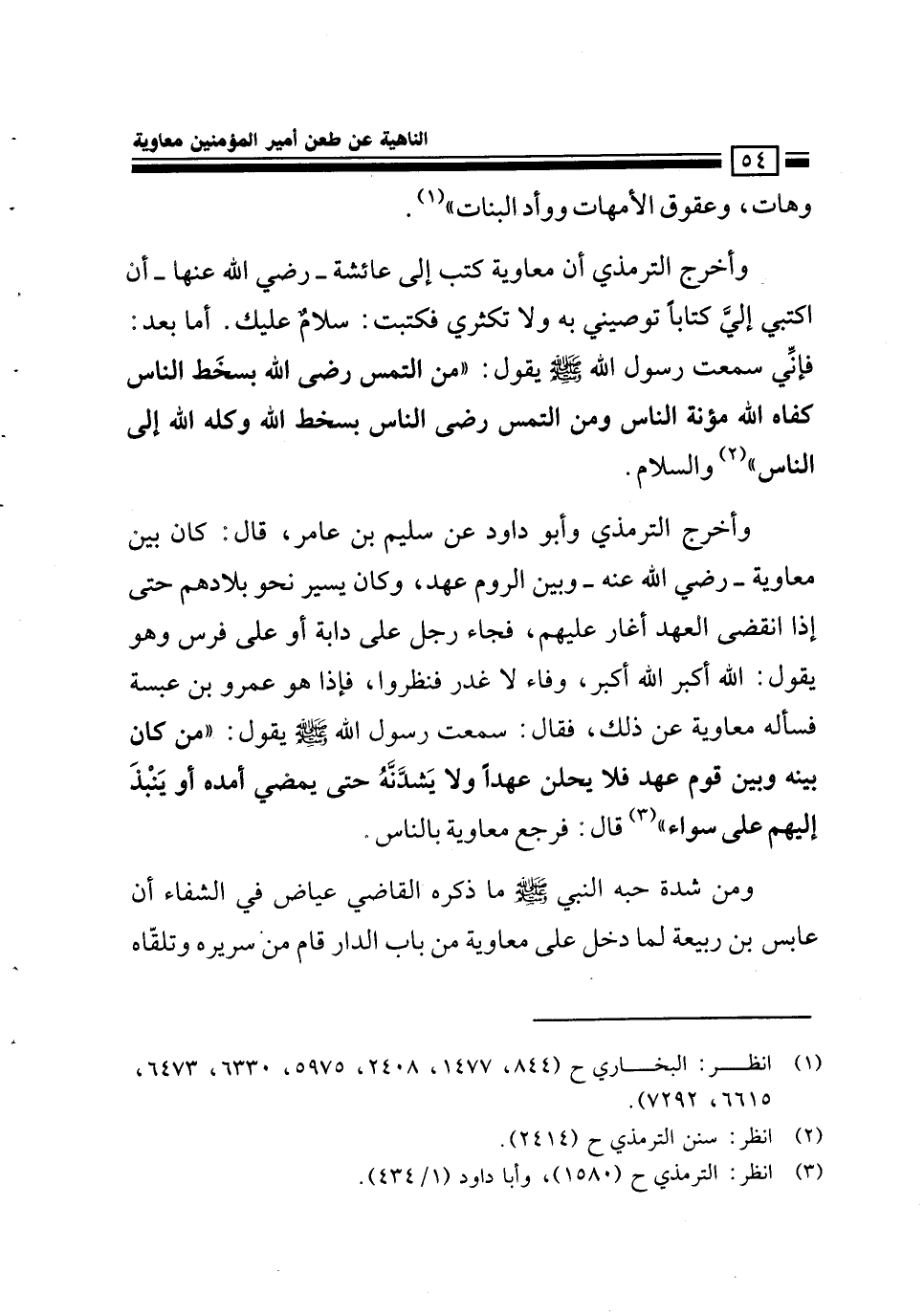 وأخرج الترمذي أن معاوية كتب إلى عائشة رضي الله عنها أن اكتبي إلي كتابا توصيني به ولا تكثري فكتبت: سلام عليك أما بعد فإني سمعت رسول الله - صلى الله عليه وسلم - يقول: «من التمس رضى الله بسخط الناس كفاه الله مؤنة الناس ومن التمس رضى الناس بسخط الله وكله الله إلى الناس» والسلام.