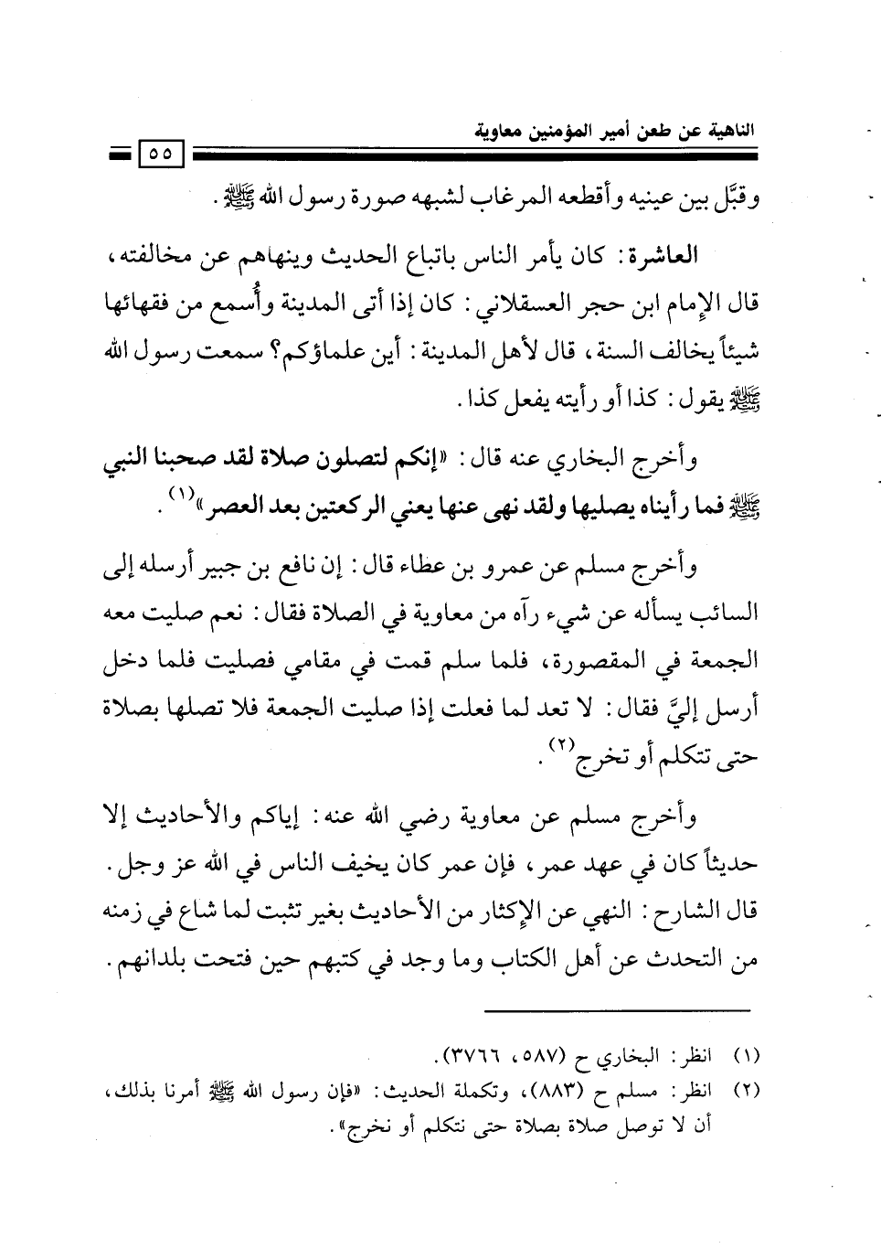 وأخرج مسلم عن عمرو بن عطاء قال: إن نافع بن جبير أرسله إلى السائب يسأله عن شيء رآه من معاوية في الصلاة فقال: نعم صليت معه الجمعة في المقصورة فلما سلم قمت في مقامي فصليت فلما دخل أرسل إلي فقال: لا تعد لما فعلت، إذا صليت الجمعة فلا تصلها بصلاة حتى تتكلم أو تخرج.