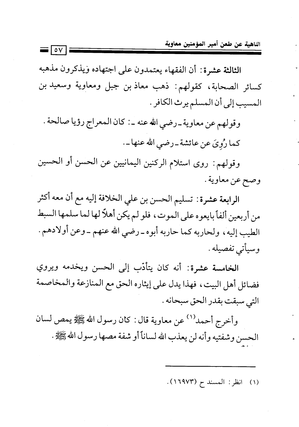 الثالثة عشرة: أن الفقهاء يعتمدون على اجتهاده ويذكرون مذهبه كسائر الصحابة، كقولهم: ذهب معاذ بن جبل ومعاوية وسعيد بن المسيب إلى أن المسلم يرث الكافر، وقولهم عن معاوية رضي الله عنه كان المعراج رؤيا صالحة كما روي عن عائشة رضي الله عنها، وقولهم روي استلام الركنين اليمانيين عن الحسن والحسين رضي الله عنهما وصح عن معاوية.