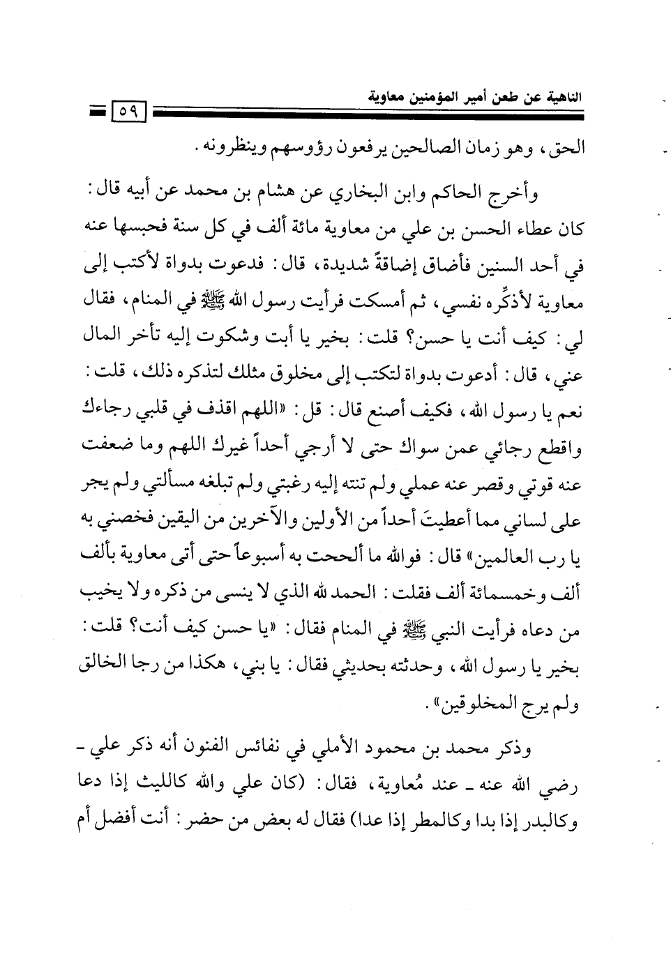 وأخرج الحاكم وابن البخاري عن هشام بن محمد عن أبيه قال: كان عطاء الحسن بن علي من معاوية مائة ألف في كل سنة فحبسها عنه في أحد السنين فاضاق إضاقة شديدة قال فدعوت بدواة لأكتب إلى معاوية رضي الله عنه لاذكره نفسي ثم أمسكت فرأيت رسول الله - صلى الله عليه وسلم - في المنام فقال لي: كيف أنت يا حسن؟ قلت: بخير يا أبت، وشكوت إليه تأخر المال عني، قال: أدعوت بدواة لتكتب إلى مخلوق مثلك لتذكره ذلك؟ قلت: نعم يا رسول الله فكيف أصنع؟ قال: قل اللهم اقذف في قلبي رجاءك واقطع رجائي عمن سواك حتى لا أرجو أحدا غيرك، اللهم وما ضعفت عنه قوتي وقصر عنه عملي ولم تنته إليه رغبتي ولم تبلغه مسألتي ولم يجر على لساني مما أعطيت أحدا من الأولين والآخرين من اليقين فخصني به يا رب العالمين، قال فوالله ما ألححت به أسبوعا حتى أتى معاوية بألف ألف وخمسمائة ألف فقلت الحمد لله الذي لا ينسى من ذكره ولا يخيب من دعاه، فرأيت النبي - صلى الله عليه وسلم - في المنام فقال: يا حسن كيف أنت؟ قلت: بخير يا رسول الله، وحدثته بحديثي فقال: يا بني هكذا من رجاء الخالق ولم يرج المخلوقين.