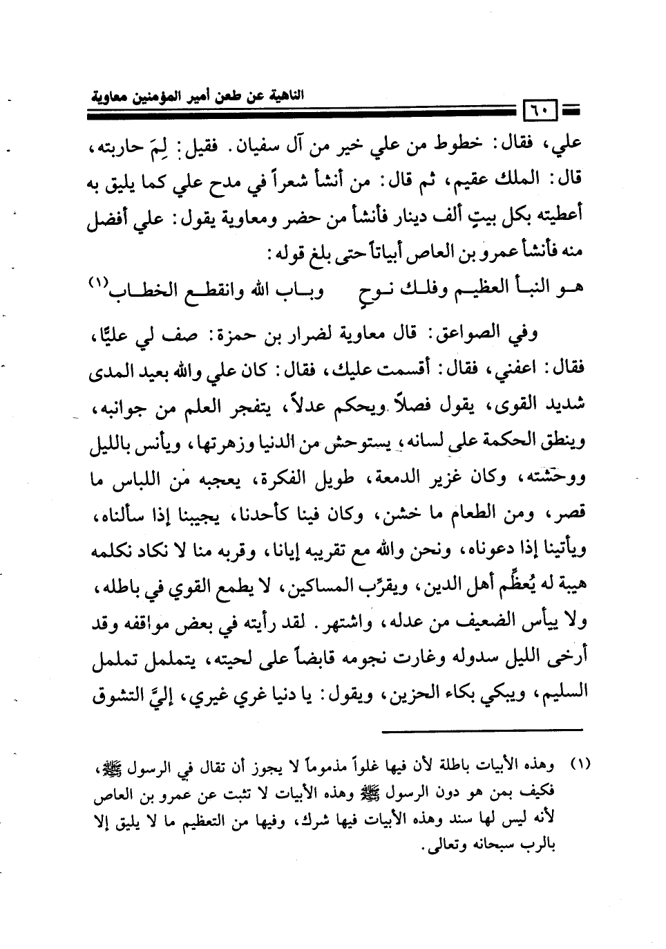 علي؟ فقال: خطوط من علي خير من آل أبي سفيان، فقيل: لم حاربته؟ قال: الملك عقيم، ثم قال: من أنشأ شعرا في مدح علي كما يليق به أعطيته بكل بيت ألف دينار، فأنشأ من حضر ومعاوية يقول: علي أفضل منه، فأنشأ عمرو بن العاص أبياتا حتى بلغ قوله: بيت