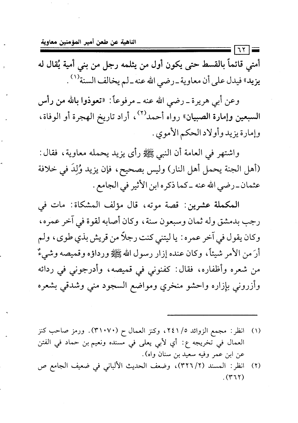 أمتي قائما بالقسط حتى يكون أول من يثلمه رجل من بني أمية يقال له يزيد" فيدل على أن معاوية رضي الله عنه لم يخالف السنة. وعن أبي هريرة رضي الله عنه مرفوعا: "تعوذوا بالله من رأس السبعين وإمارة الصبيان" رواه أحمد. أراد تأريخ الهجرة أو الوفاة وإمارة يزيد وأولاد الحكم الأموي. واشتهر في العامة أن النبي - صلى الله عليه وسلم - رأى يزيد يحمله معاوية فقال: أهل الجنة يحمل أهل النار. وليس بصحيح فإن يزيد ولد في خلافة عثمان رضي الله عنه كما ذكره ابن الاثير في الجامع.