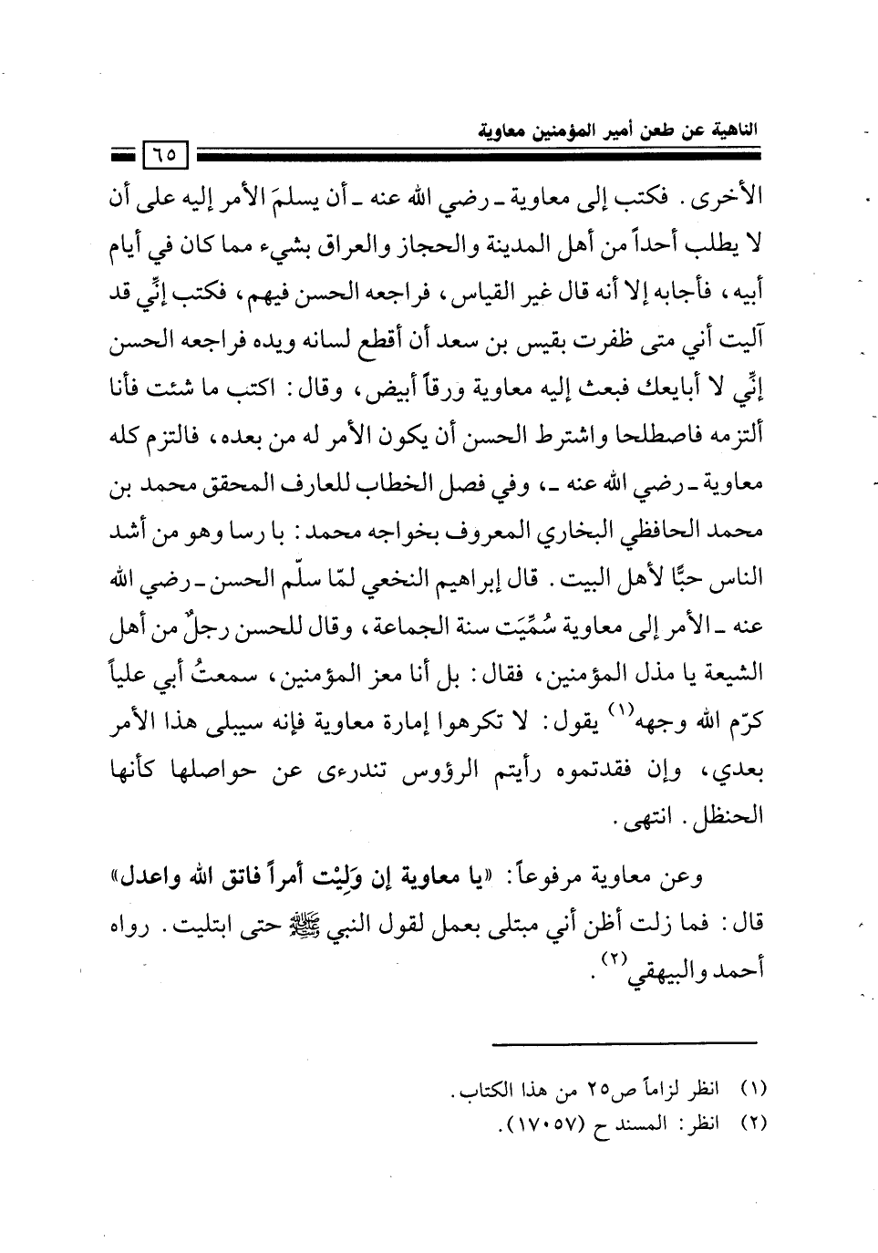 وفي فصل الخطاب للعارف المحقق محمد بن محمد الحافظي البخاري المعروف بخواجه محمد بارسا، هو من أشد الناس حبا لأهل البيت: قال إبراهيم النخعي: لما سلم الحسن رضي الله عنه الأمر إلى معاوية سميت سنة الجماعة، وقال للحسن رضي الله عنه رجل من أهل الشيعة: يا مذل المؤمنين، فقال: بل أنا معز المؤمنين، سمعت أبي عليا كرم الله وجهه يقول: لا تكرهوا إمارة معاوية فإنه سيلي هذا الأمر بعدي وإن فقدتموه رأيتم الرؤس تندر عن حواصلها كأنها الحنظل. انتهى.