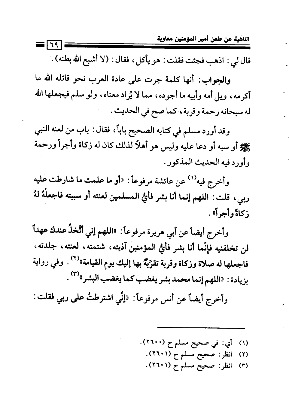والجواب أنها كلمة جرت على عادة العرب، نحو قاتله الله ما أكرمه ويل أمه وأبيه ما أجودهما، لا يراد معناه. ولو سلم فيجعلها الله له سبحانه رحمة وقربة كما صح في الحديث. وقد أورد مسلم في كتابه الصحيح بابا فقال: باب من لعنه النبي - صلى الله عليه وسلم - أو سبه أو دعا عليه وليس هو أهل ذلك كان له زكاة وأجرا ورحمة، وأورد فيه الحديث المذكور. وأخرج فيه عن عائشة مرفوعا: «أوَما علمت ما شارطت عليه ربي قلتُ اللهم إنما أنا بشر فأي المسلمين لعنته أو سببته فاجعل له زكاة ورحمة» وأخرج أيضا عن أبي هريرة مرفوعا: «اللهم إني أتخذ عندك عهدا لن تخلفنيه فإنما أنا بشر فاي المسلمين آذيته شتمته لعنته أو جلدته فاجعلها له صلاة وزكاة وقربة تقربه بها اليك يوم القيامة» وفي رواية بزيادة: «اللهم إنما محمد بشر يغضب كما يغضب البشر» وأخرج أيضا عن أنس مرفوعا: «اني اشترطت على ربي فقلت