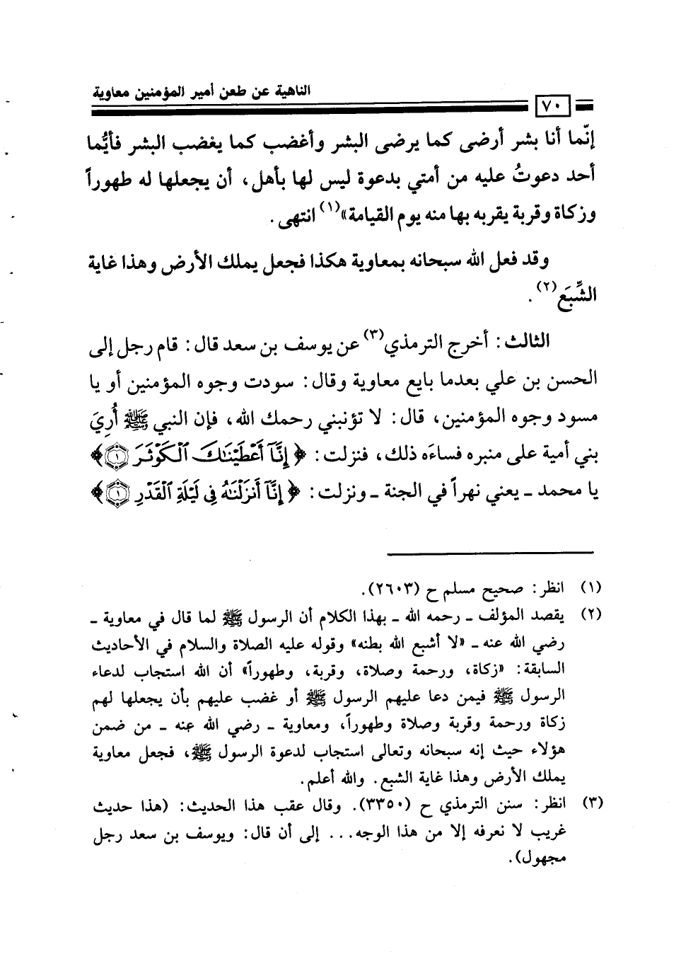 الثالث: أخرج الترمذي عن يوسف بن سعيد قال: قام رجل إلى الحسن بن علي بعد ما بايع معاوية وقال: سودت وجوه المؤمنين، أو يا مسود وجوه المؤمنين، قال: لا تؤنبني رحمك الله فإن النبي - صلى الله عليه وسلم - أري بني أمية على منبره فساءه ذلك فترلت: إنا أعطيناك الكوثر يا محمد يعني نهرا في الجنة ونزلت: إنا أنزلناه في ليلة القدر