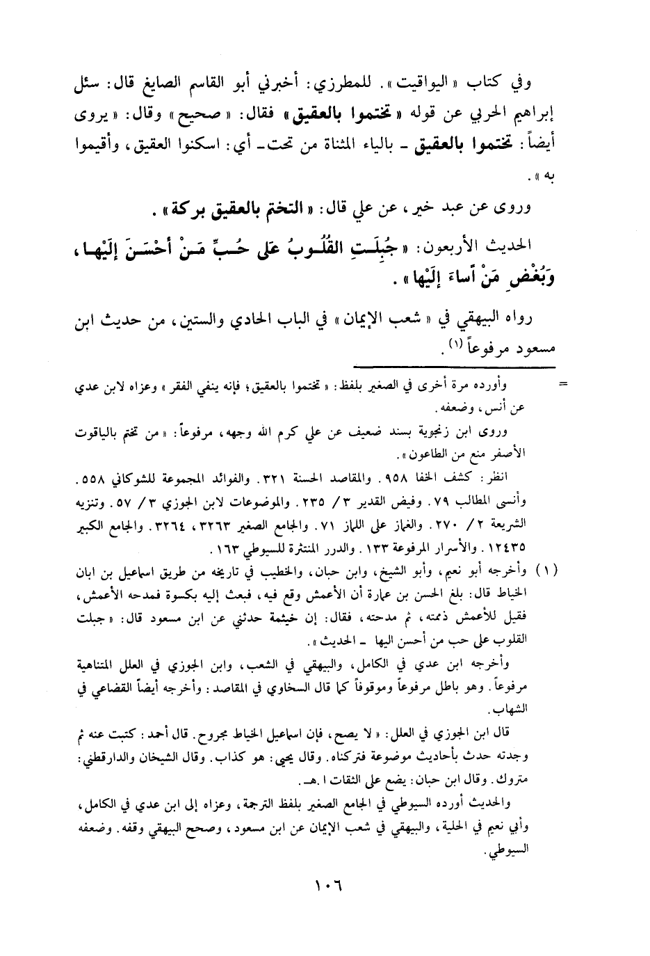 وَفِي كتاب اليواقيت للمطرزي اخبرني ابو الْقَاسِم الصايغ قَالَ سُئِلَ ابراهيم الْحَرْبِيّ عَن قَوْله تختموا بالعقيق فَقَالَ صَحِيح وَقَالَ يرْوى ايضا تختموا بالعقيق بِالْيَاءِ الْمُثَنَّاة من تَحت أَي اسكنوا العقيق واقيموا بِهِ