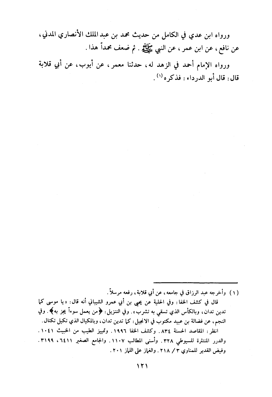 وَرَوَاهُ ابْن عدي فِي الْكَامِل من حَدِيث مُحَمَّد بن عبد الْملك الانصاري الْمدنِي عَن نَافِع عَن ابْن عمر عَن النَّبِي صلى الله عَلَيْهِ وَسلم ثمَّ ضعف مُحَمَّدًا هَذَا