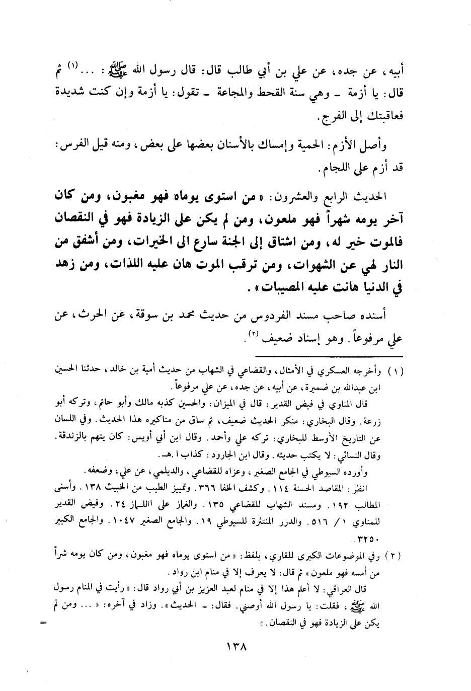الحَدِيث الرَّابِع وَالْعشْرُونَ من اسْتَوَى يوماه فَهُوَ مغبون وَمن كَانَ آخر يَوْمه شهرا فَهُوَ مَلْعُون وَمن لم يكن على الزِّيَادَة فَهُوَ فِي النُّقْصَان فالموت خير لَهُ وَمن اشتاق الى الْجنَّة سارع الى الْخيرَات وَمن اشفق من النَّار لهي عَن الشَّهَوَات وَمن ترقب الْمَوْت هان عَلَيْهِ اللَّذَّات وَمن زهد فِي الدُّنْيَا هَانَتْ عَلَيْهِ المصيبات