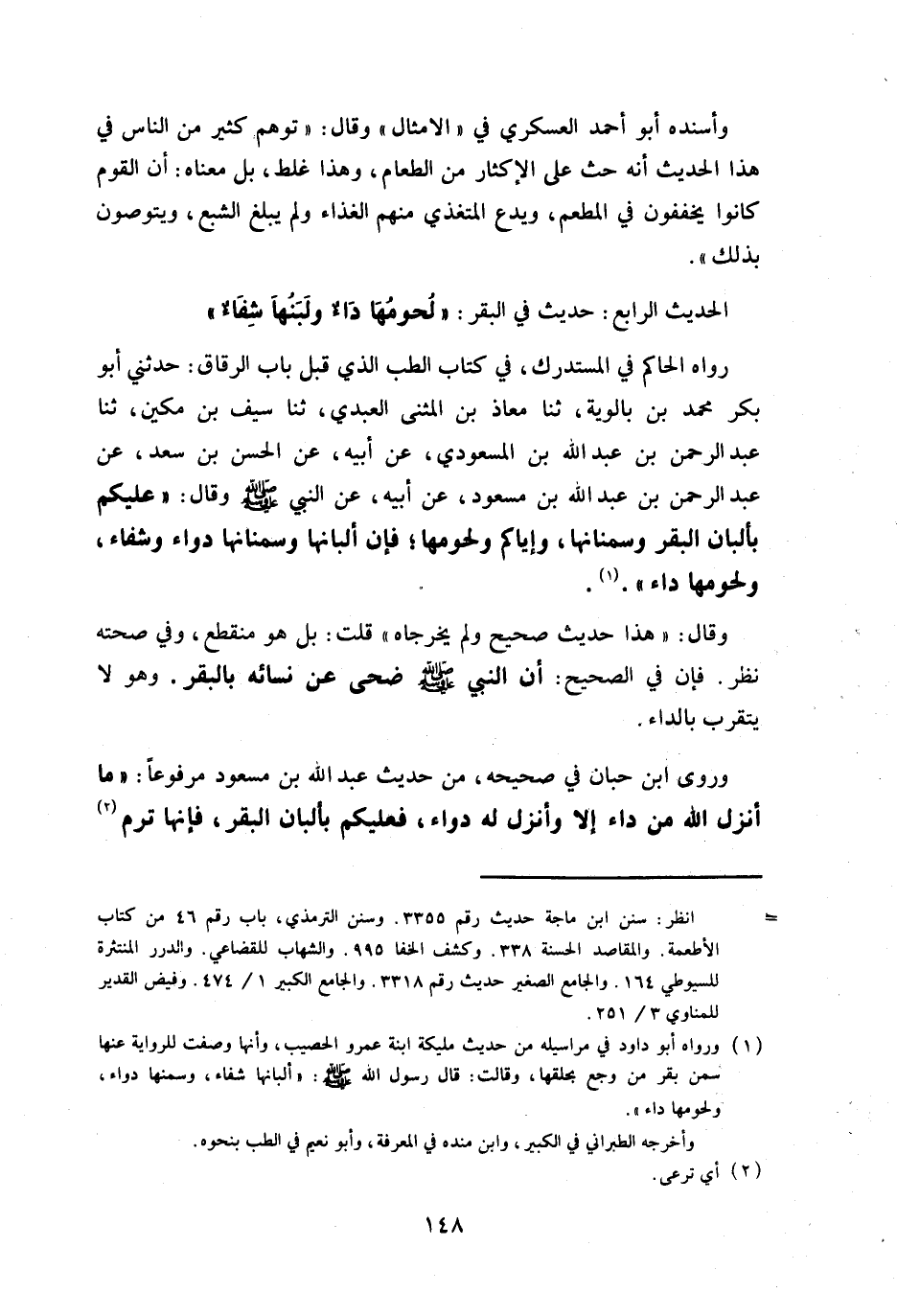 رَوَاهُ الْحَاكِم فِي الْمُسْتَدْرك فِي كتاب الطِّبّ الَّذِي قبل بَاب الرقَاق حَدثنِي ابو بكر مُحَمَّد بن بالوية ثَنَا معَاذ بن الْمثنى الْعَبْدي ثَنَا سيف بن مكين ثَنَا عبد الرَّحْمَن بن عبد الله بن المَسْعُودِيّ عَن ابيه عَن الْحسن بن سعد عَن عبد الرَّحْمَن بن عبد الله بن مَسْعُود عَن ابيه عَن النَّبِي صلى الله عَلَيْهِ وَسلم وَقَالَ عَلَيْكُم بألبان الْبَقر وسمنانها واياكم ولحومها فَإِن البانها وسمنانها دَوَاء وشفاء ولحومها دَاء