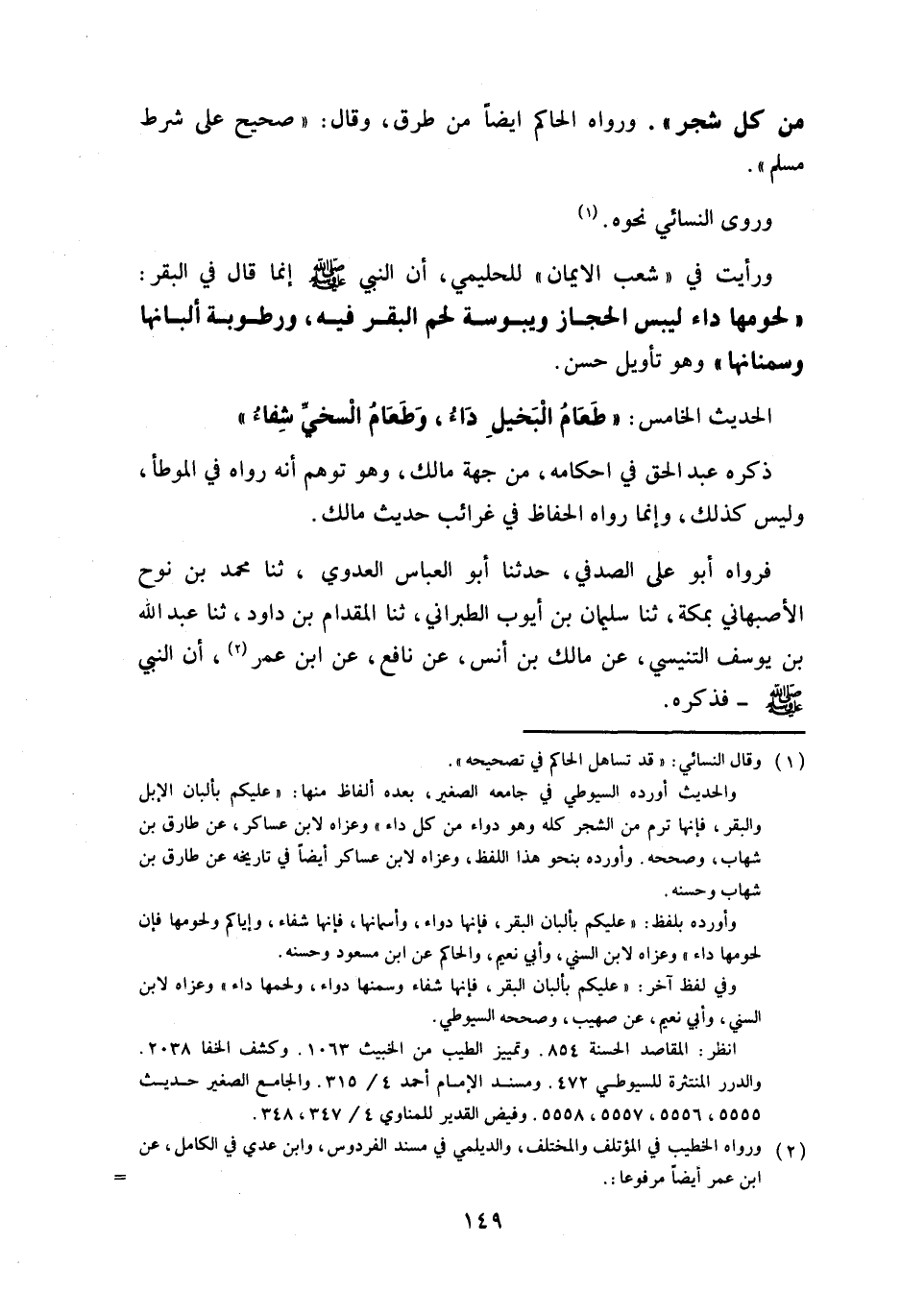 وَرَأَيْت فِي شعب الايمان للحليمي ان النَّبِي ص صلى الله عَلَيْهِ وَسلم انما قَالَ فِي الْبَقر لحومها دَاء ليبس الْحجاز ويبوسة لحم الْبَقر فِيهِ ورطوبة أَلْبَانهَا وسمنانها وَهُوَ تَأْوِيل حسن