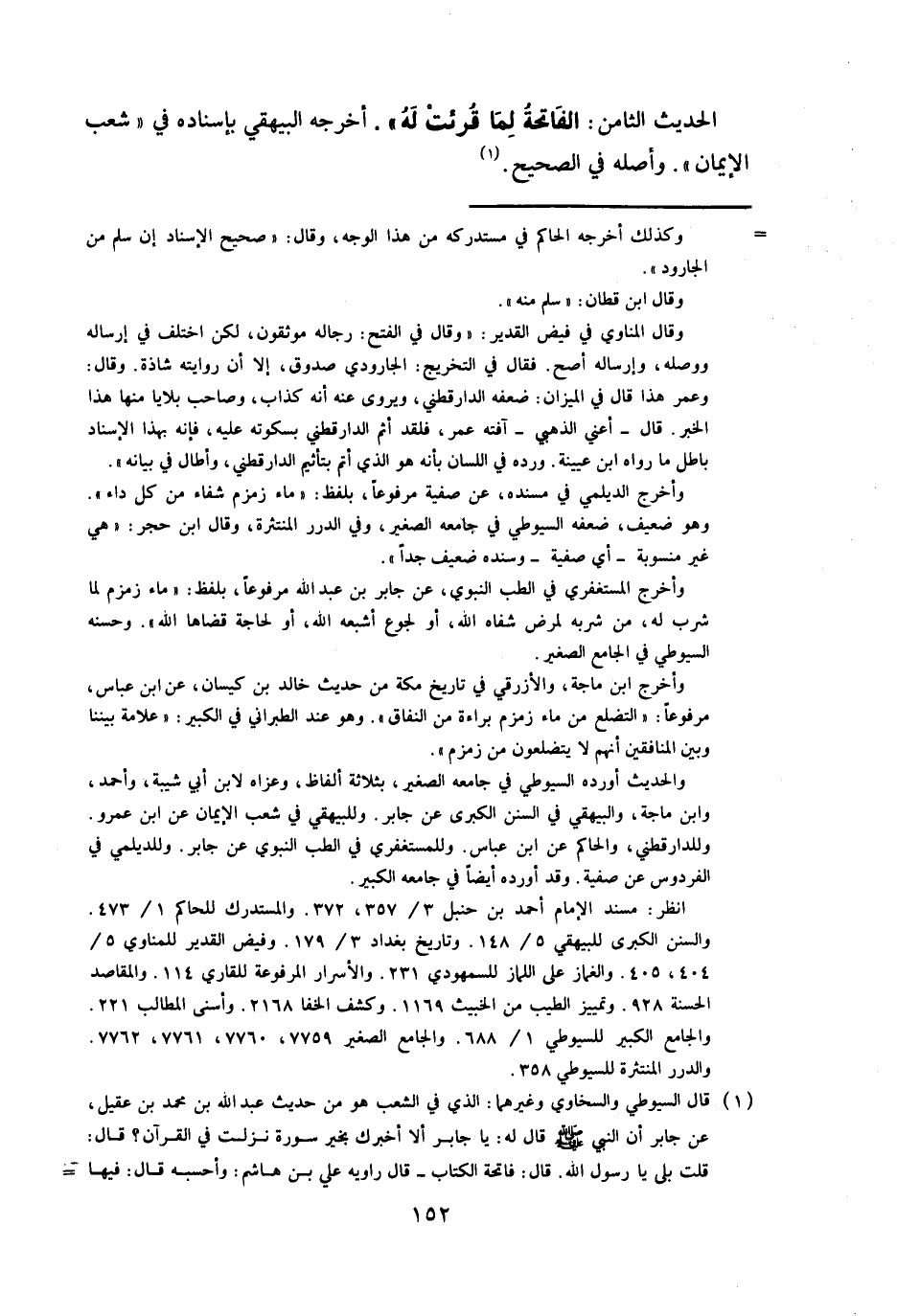 الحَدِيث الثَّامِن الْفَاتِحَة لما قُرِئت لَهُ اخرجه الْبَيْهَقِيّ بِإِسْنَادِهِ فِي شعب الايمان واصله فِي الصَّحِيح