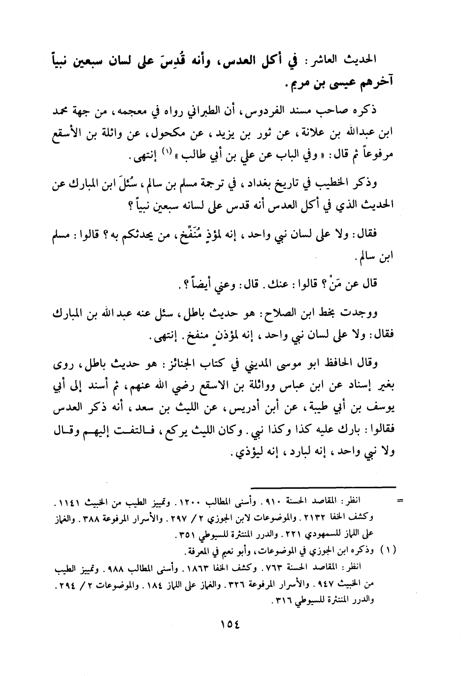 وَذكر الْخَطِيب فِي تارخ بَغْدَاد فِي تَرْجَمَة مُسلم بن سَالم سُئِلَ ابْن الْمُبَارك عَن الحَدِيث الَّذِي فِي اكل العدس انه قدس على لِسَان سبعين نَبيا