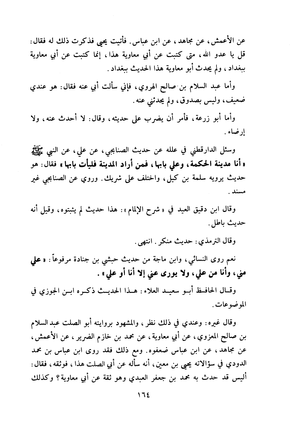وَقَالَ غَيره وَعِنْدِي فِي ذَلِك نظر والمشهود بروايته ابو الصَّلْت عبد السَّلَام بن صَالح المعزوي عَن ابي مُعَاوِيَة عَن مُحَمَّد بن خازم الضَّرِير عَن الاعمش عَن مُجَاهِد عَن ابْن عَبَّاس ضَعَّفُوهُ وَمَعَ ذَلِك فقد روى ابْن عَبَّاس بن مُحَمَّد الدودي فِي سؤالاته يحيى بن معِين انه سَأَلَهُ عَن ابي الصَّلْت هَذَا فوثقه فَقَالَ الْيَسْ قد حدث بِهِ مُحَمَّد بن جَعْفَر الْعَبْدي وَهُوَ ثِقَة عَن ابي مُعَاوِيَة وَكَذَلِكَ