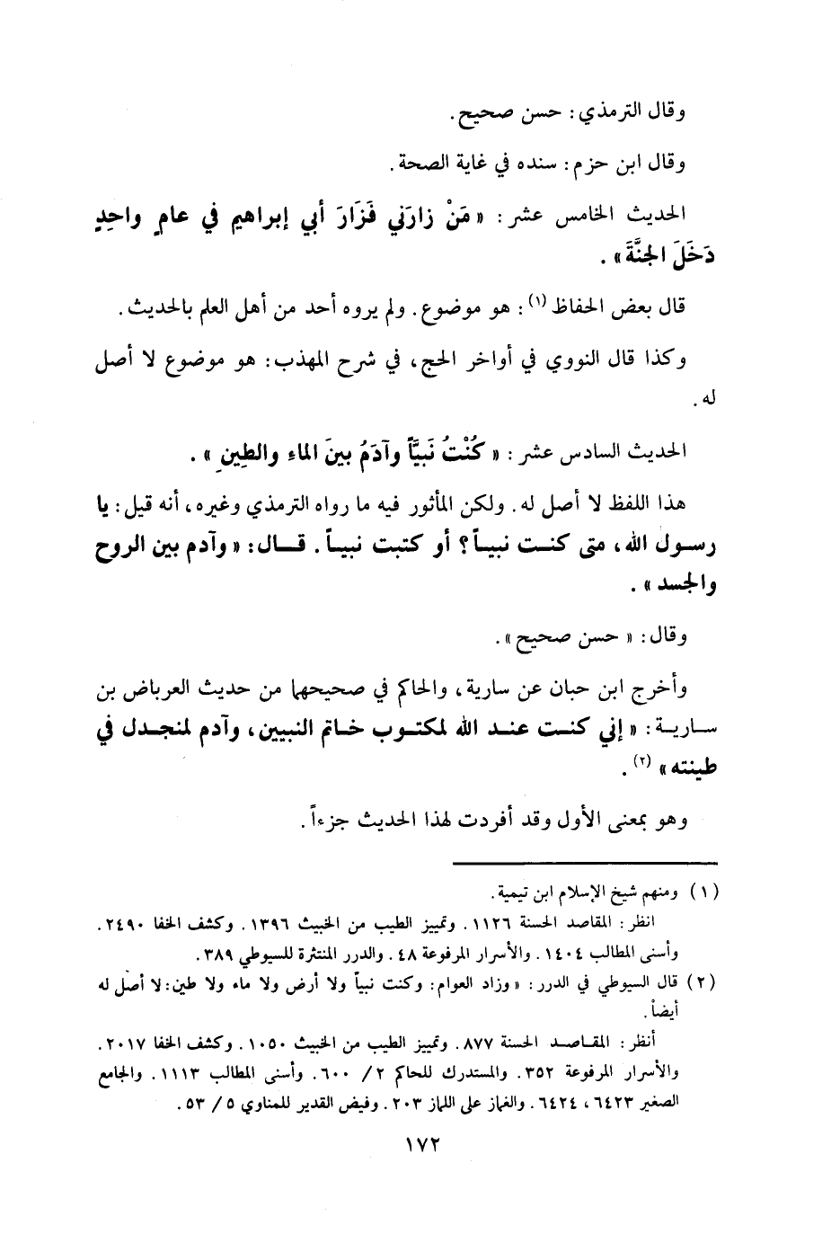 هَذَا اللَّفْظ لَا اصل لَهُ وَلَكِن الْمَأْثُور فِيهِ مَا رَوَاهُ التِّرْمِذِيّ وَغَيره انه قيل يَا رَسُول الله مَتى كنت نَبيا اَوْ كتبت نَبيا قَالَ وآدَم بَين الرّوح والجسد