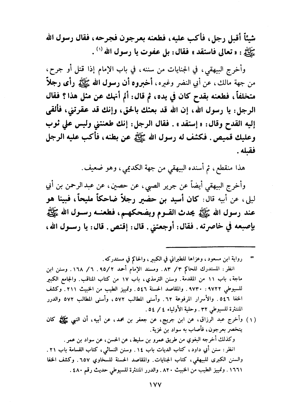 واخرج الْبَيْهَقِيّ فِي الْجِنَايَات من سنَنه فِي بَاب الامام اذا قتل اَوْ جرح من جِهَة مَالك عَن ابي النَّضر وَغَيره اخبروه ان رَسُول الله صلى الله عَلَيْهِ وَسلم رأى رجلا مُتَخَلِّفًا فطعنه بقدح كَانَ فِي يَده ثمَّ قَالَ الم انهك عَن مثل هَذَا فَقَالَ الرجل يَا رَسُول الله ان الله قد بَعثك بِالْحَقِّ وانك قد عقرتني فَألْقى اليه الْقدح وَقَالَ استقد فَقَالَ الرجل انك طعنتني وَلَيْسَ عَليّ ثوب وَعَلَيْك قَمِيص فكشف لَهُ رَسُول الله صلى الله عَلَيْهِ وَسلم عَن بَطْنه فأكب عَلَيْهِ الرجل فَقبله