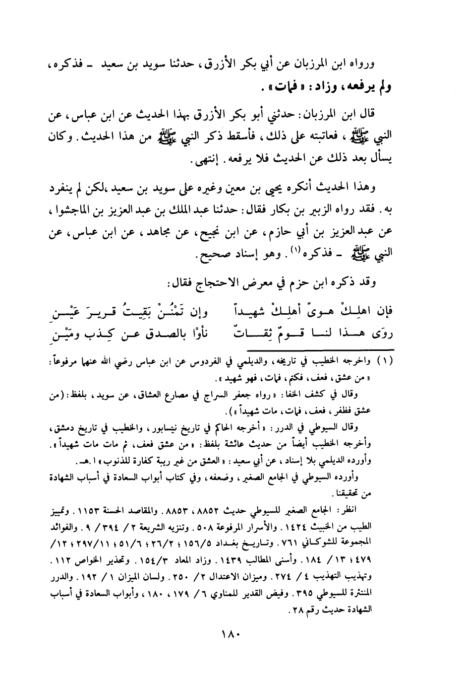 وَهَذَا الحَدِيث انكره يحيى بن معِين وَغَيره على سُوَيْد بن سعيد لَكِن لم ينْفَرد بِهِ فقد رَوَاهُ الزبير ابْن بكار فَقَالَ حَدثنَا عبد الْملك بن عبد الْعَزِيز بن الماجشوا عَن عبد الْعَزِيز بن ابي حَازِم عَن ابْن نجيح عَن مُجَاهِد عَن ابْن عَبَّاس عَن النَّبِي صلى الله عَلَيْهِ وَسلم فَذكره وَهُوَ اسناد صَحِيح
