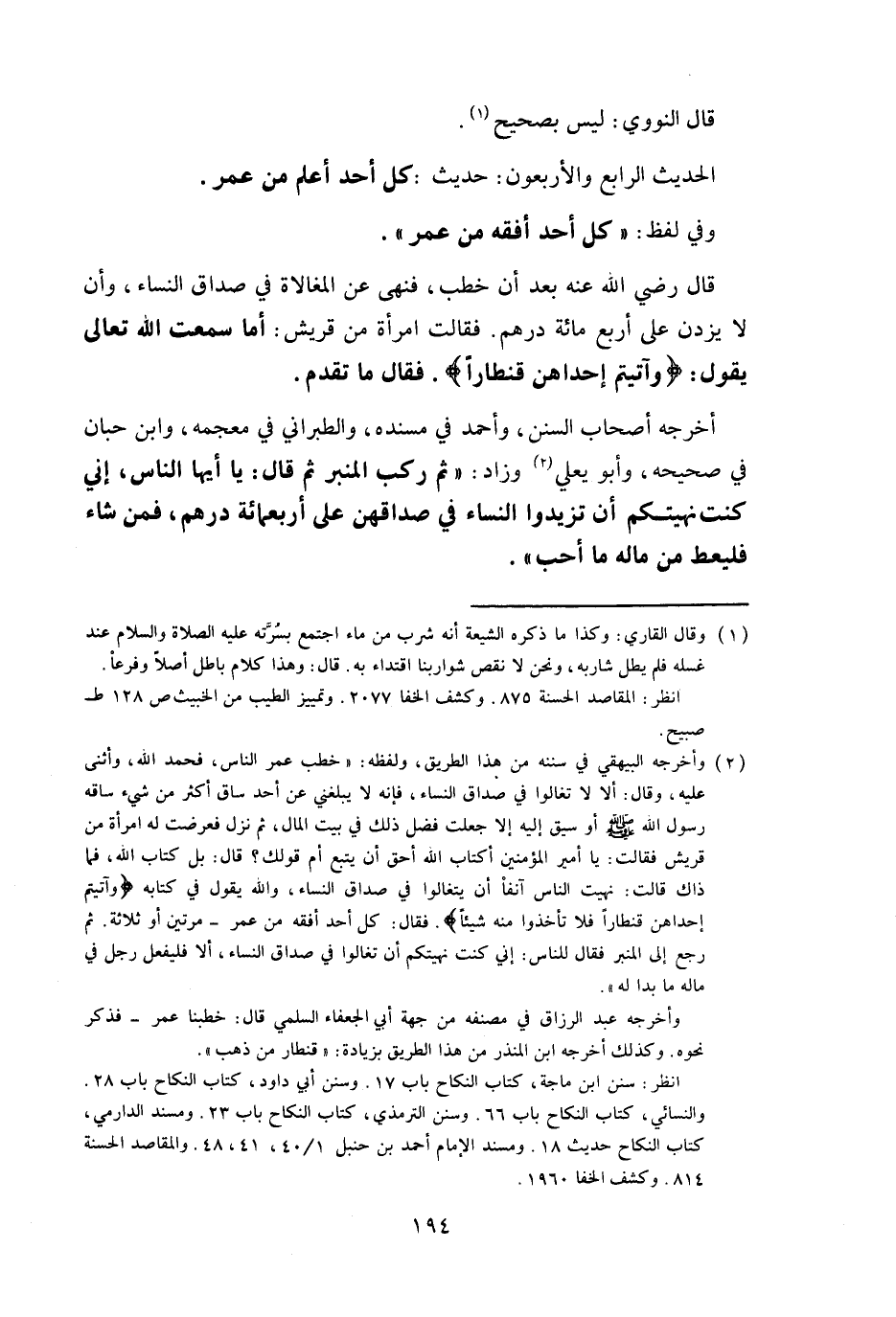 قَالَ رَضِي الله عَنهُ بعد ان خطب فَنهى عَن المغالاة فِي صدَاق النِّسَاء وان لَا يزدن على ارْبَعْ مائَة دِرْهَم فَقَالَت امْرَأَة من قُرَيْش اما سَمِعت الله تَعَالَى يَقُول