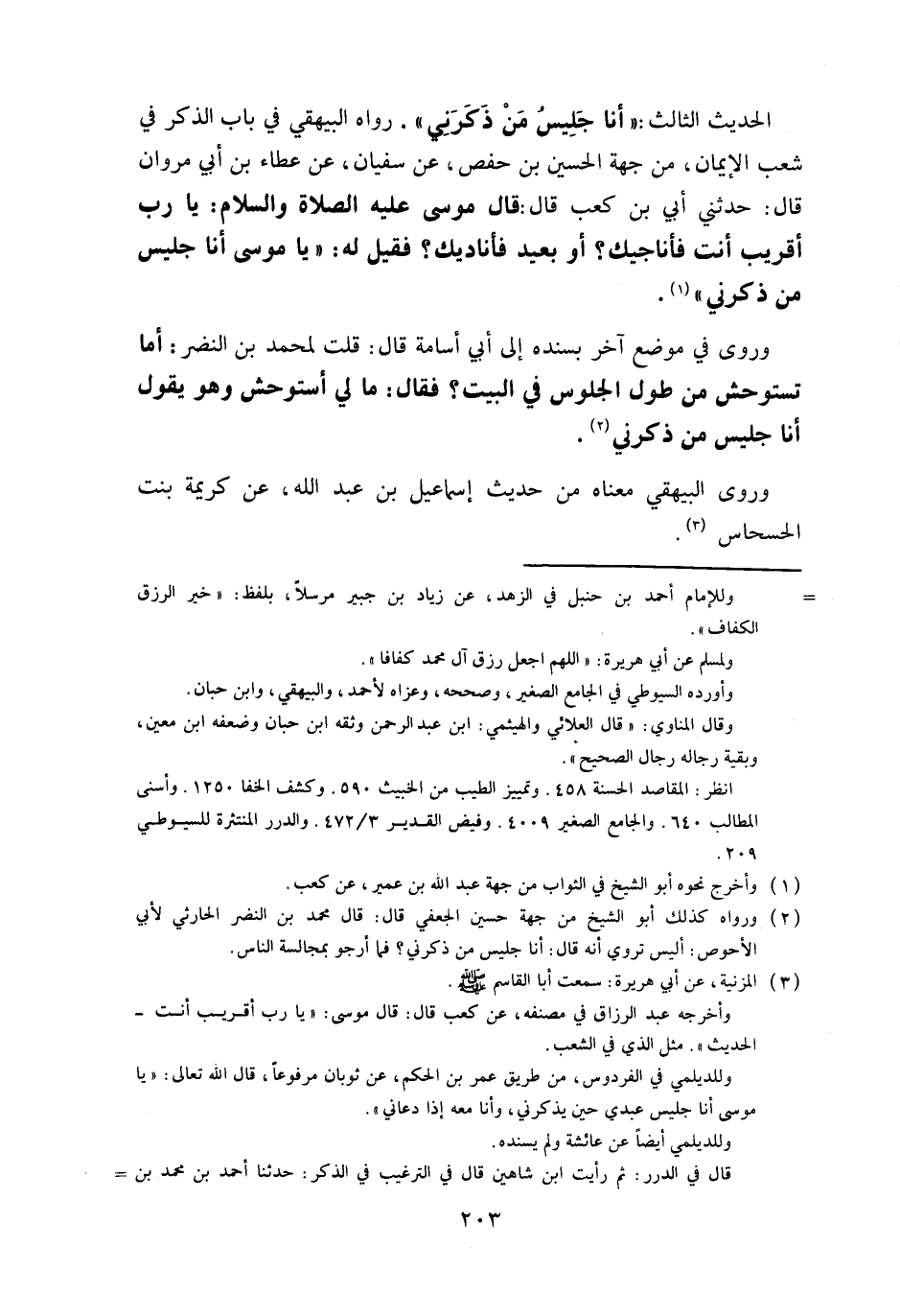 الحَدِيث الثَّالِث انا جليس من ذَكرنِي رَوَاهُ الْبَيْهَقِيّ فِي بَاب الذّكر فِي شعب الايمان من جِهَة الْحُسَيْن ابْن حَفْص عَن سُفْيَان عَن عَطاء بن ابي مَرْوَان قَالَ حَدثنِي ابي بن كَعْب قَالَ قَالَ مُوسَى عَلَيْهِ الصَّلَاة وَالسَّلَام يَا رب اقريب انت فأناجيك اَوْ بعيد فأناديك فَقيل لَهُ يَا مُوسَى انا جليس من يذكرنِي