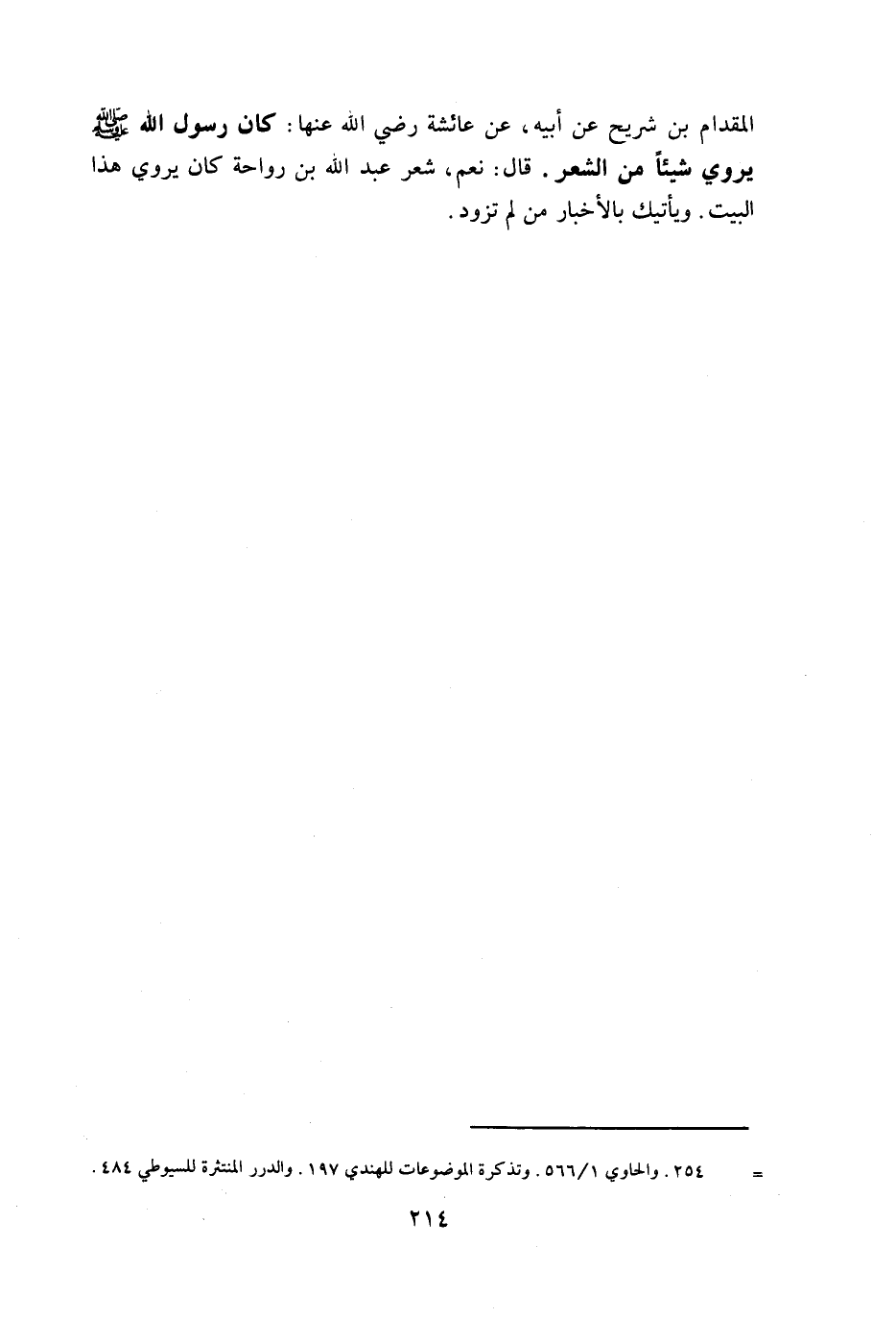 الْمِقْدَام بن شُرَيْح عَن ابيه عَن عَائِشَة رَضِي الله عَنْهَا كَانَ رَسُول الله صلى الله عَلَيْهِ وَسلم يروي شَيْئا من الشّعْر قَالَ نعم شعر عبد الله بن رَوَاحَة كَانَ يروي هَذَا الْبَيْت ويأتيك بالاخبار من لم تزَود
