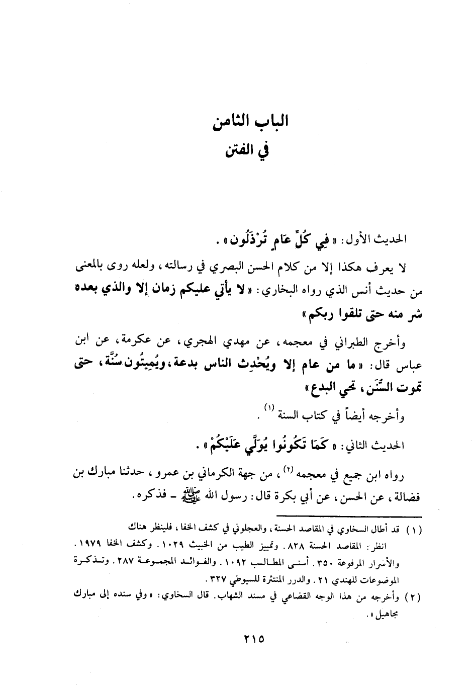 واخرج الطَّبَرَانِيّ فِي مُعْجَمه عَن مهْدي الهجري عَن عِكْرِمَة عَن ابْن عَبَّاس قَالَ مَا من عَام الا وَيحدث النَّاس بِدعَة ويميتون سنة حَتَّى تَمُوت السّنَن تحي الْبدع