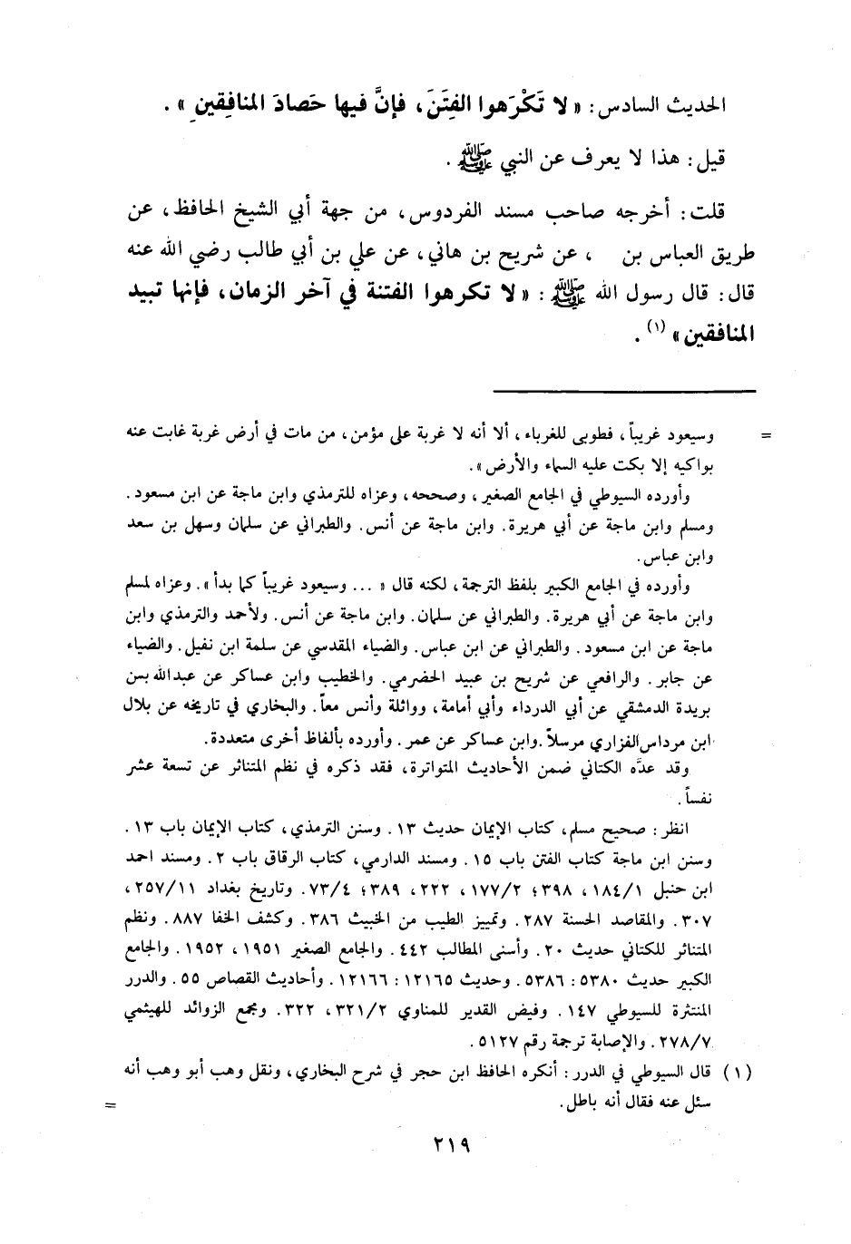 الحَدِيث السَّادِس لَا تكْرهُوا الْفِتَن فَإِن فِيهَا حصاد الْمُنَافِقين