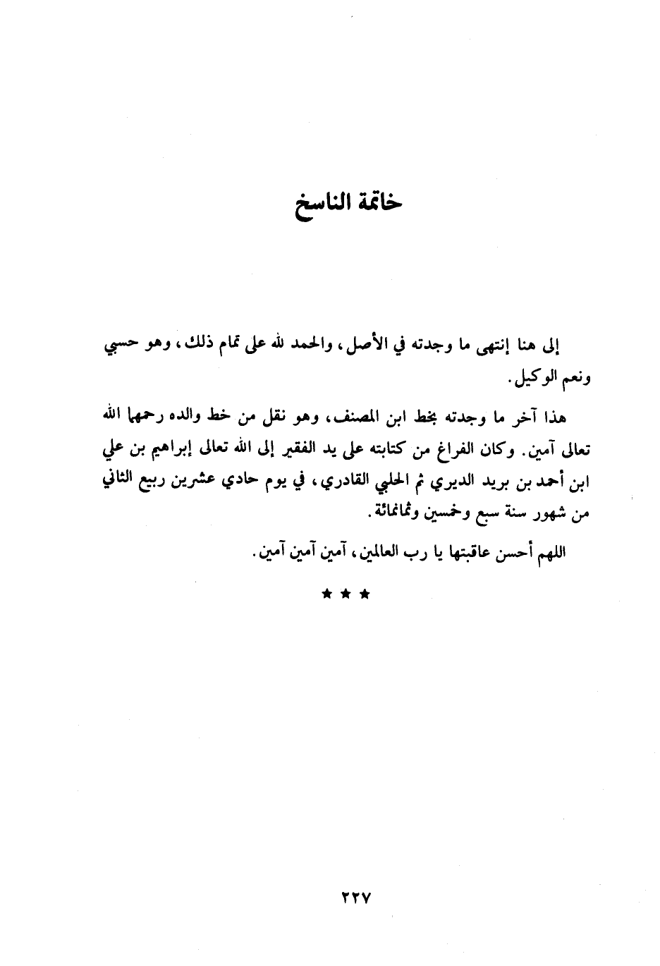 هَذَا آخر مَا وجدته بِخَط ابْن المُصَنّف وَهُوَ نقل من خطّ وَالِده رحمهمَا الله تَعَالَى آمين وَكَانَ الْفَرَاغ من كِتَابَته على يَد الْفَقِير الى الله تَعَالَى ابراهيم بن عَليّ بن احْمَد بن بريد الديري ثمَّ الْحلَبِي القادري فِي يَوْم حادي عشْرين ربيع الثَّانِي من شهور سنة سبع وَخمسين وَثَمَانمِائَة