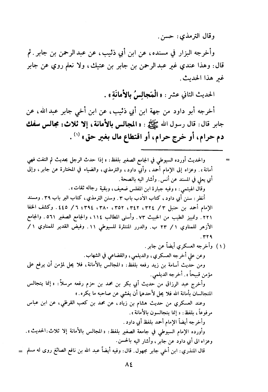 اخرجه ابو دَاوُد من جِهَة ابْن ابي ذئيب عَن ابْن اخي جَابر عبد الله عَن جَابر قَالَ قَالَ رَسُول الله صلى الله عَلَيْهِ وَسلم الْمجَالِس بالامانة الا ثَلَاث مجَالِس سفك دم حرَام اَوْ خرج حرَام اَوْ اقتطاع مَال بِغَيْر حق