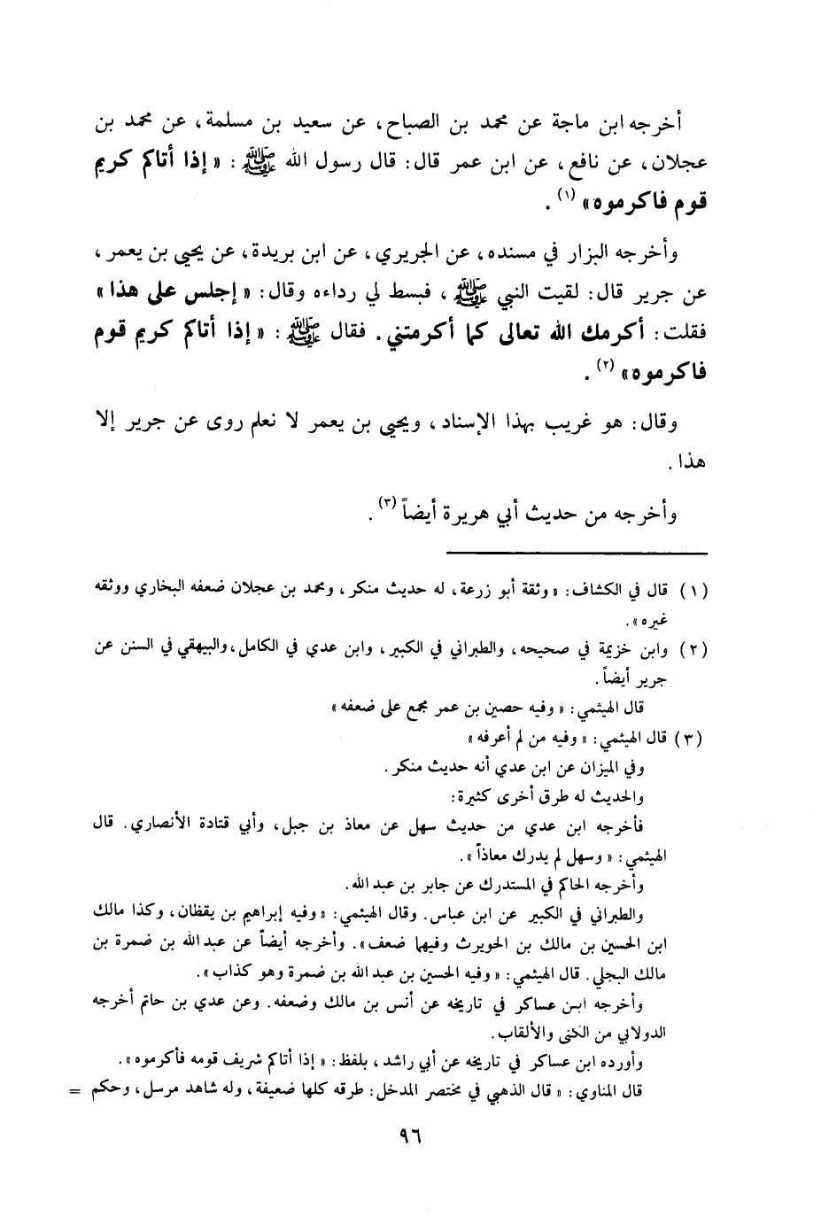 اخرجه ابْن ماجة عَن مُحَمَّد بن الصَّباح عَن سعيد بن مسلمة عَن مُحَمَّد بن عجلَان عَن نَافِع عَن ابْن عمر قَالَ قَالَ رَسُول الله ص صلى الله عَلَيْهِ وَسلم اذا أَتَاكُم كريم قوم فأكرموه