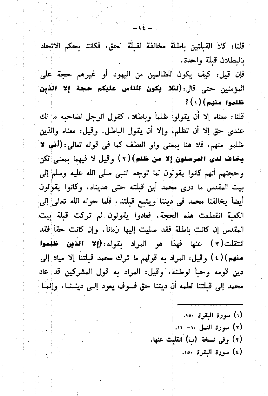 وحجتهم أنهم كانوا يقولون لما توجه النبى صلى الله عليه وسلم إلى بيت المقدس ما درى محمد أين قبلته حتى هديناه، وكانوا يقولون أيضاً يخالفنا محمد في ديننا ويتبع قبلتنا، فلما حوله الله تعالى إلى