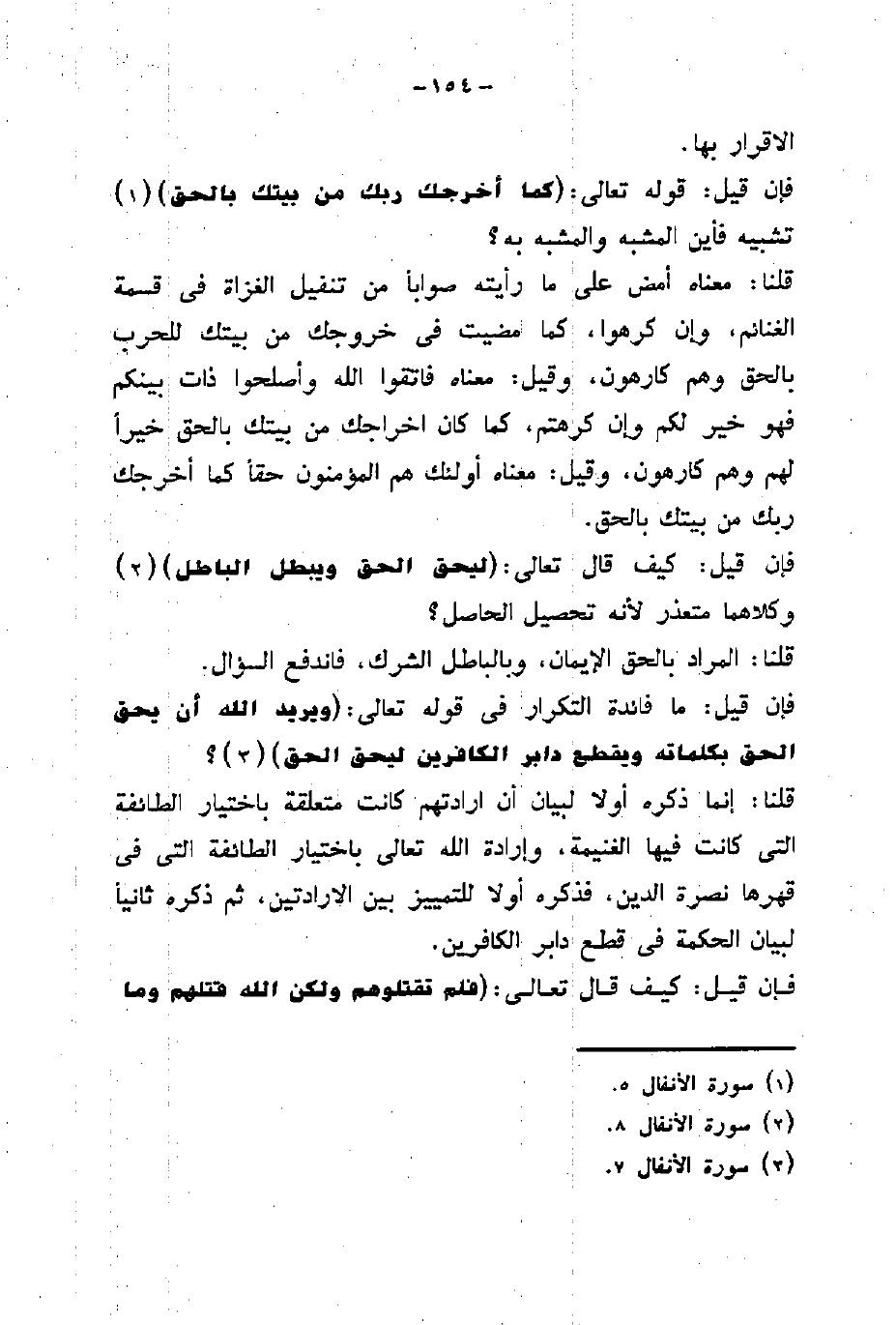 قلنا: إنما ذكره أولا لبيان أن ارادتهم كانت متعلقة باختيار الطائفة التى كانت فيها الغنية، وإرادة الله تعالى باختيار الطائفة التى في قهرها نصرة الدين، فذكره أولا للتمييز بين الارادتين، ثم ذكره ثانيا لبيان الحكمة في قطع دابر الكافرين.