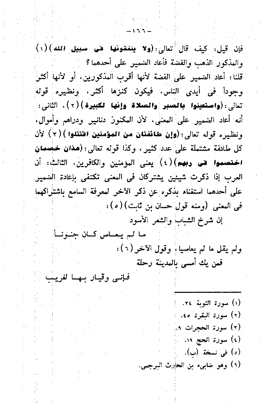 قلنا: أعاد الضمير على الفضة لأنها أقرب المذكورين، أو لأنها أكثر وجودا في أيدى الناس، فيكون كنزها أكثر، ونظيره قوله تعالى: (وَاسْتَعِينُوا بِالصَّبْرِ وَالصَّلَاةِ وَإِنَّهَا لَكَبِيرَةٌ) .