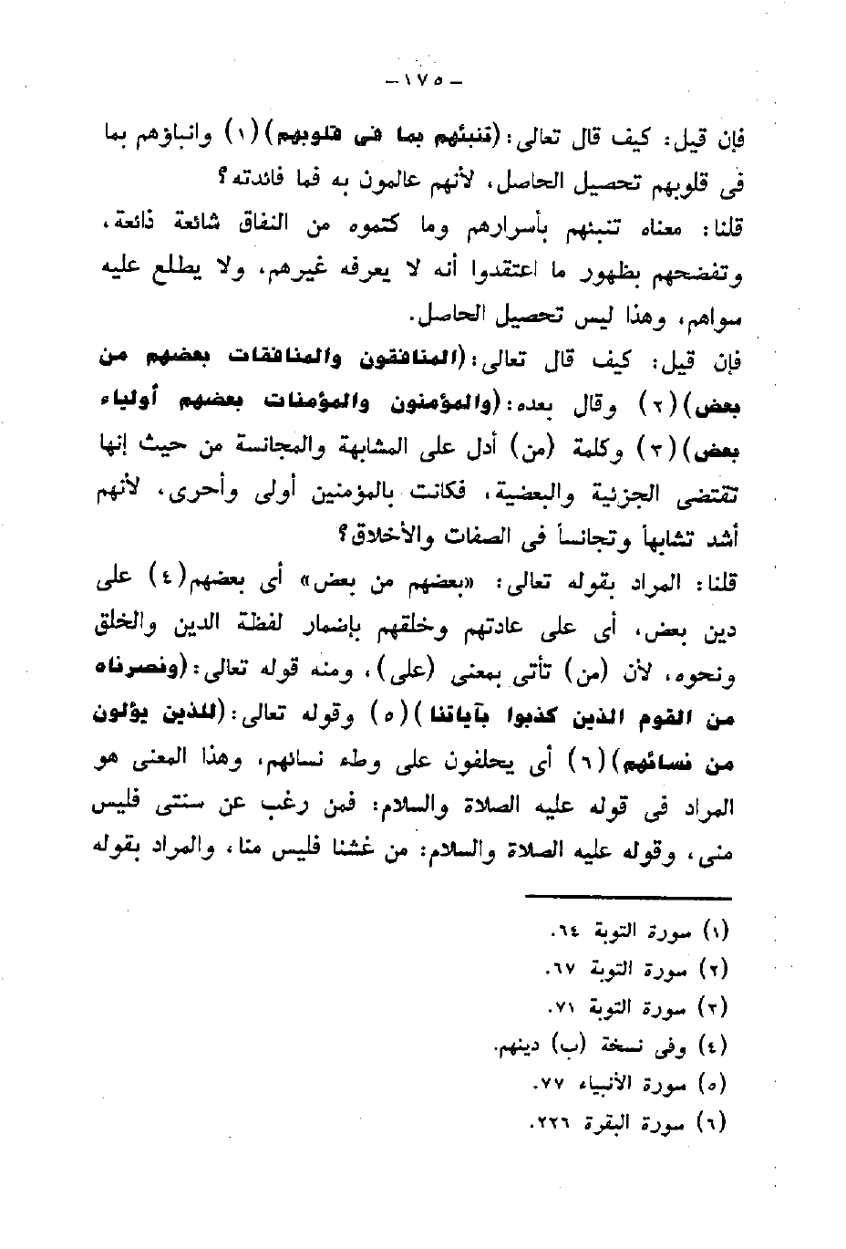 فإن قيل: كيف قال تعالى: (الْمُنَافِقُونَ وَالْمُنَافِقَاتُ بَعْضُهُمْ مِنْ بَعْضٍ) وقال بعده: (وَالْمُؤْمِنُونَ وَالْمُؤْمِنَاتُ بَعْضُهُمْ أَوْلِيَاءُ بَعْضٍ) وكلمة (من) أدل على المشابهة والمجانسة من حيث إنها تقتضى الجزئية والبعضية، فكانت بالمؤمنين أولى وأحرى، لأنهم