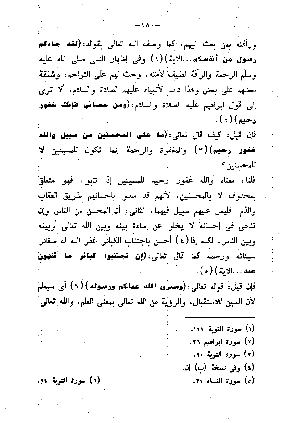 قلنا: معناه والله غفور رحيم للمسيئين إذا تابوا، فهو متعلق بمحذوف لا بالمحسنين، لأنهم قد سدوا بإحسانهم طريق العقاب والذم، فليس عليهم سبيل فيهما، الثانى: أن المحسن من الناس وإن تناهى في إحسانه لا يخلوا عن إساءة بينه وبين الله تعالى أوبينه وبين الناس لكنه إذا أحسن باجتناب الكبائر غفر الله له صغائر سيئاته ورحمه كما قال تعالى: (إِنْ تَجْتَنِبُوا كَبَائِرَ مَا تُنْهَوْنَ عَنْهُ. . .الآية) .