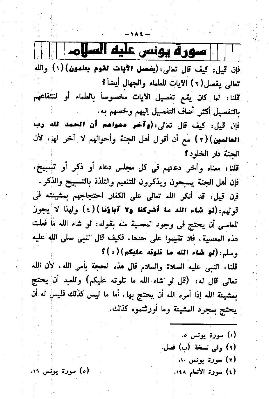 قلنا: النبى عليه الصلاة والسلام قال هذه الحجة بأمر الله، لأن الله تعالى قال له: (قُلْ لَوْ شَاءَ اللَّهُ مَا تَلَوْتُهُ عَلَيْكُمْ) وللعبد أن يحتج بمشية الله إذا أمره الله أن يحتج بها، أما ما ليس كذلك فليس له أن يحتج بمجرد المشيئة وما أورثتموه كذلك