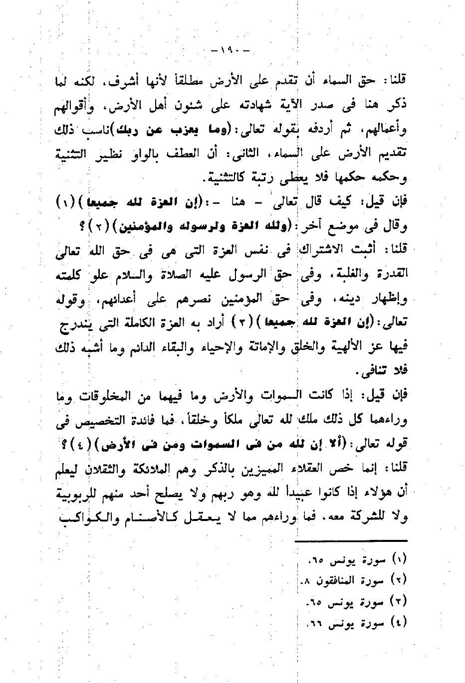 قلنا: أثبت الاشتراك في نفس العزة التى هى في حق الله تعالى القدرة والغلبة، وفى حق الرسول عليه الصلاة والسلام علو كلمته وإظهار دينه، وفى حق المؤمنين نصرهم على أعدائهم، وقوله تعالى: (إِنَّ الْعِزَّةَ لِلَّهِ جَمِيعًا) أراد به العزة الكاملة التى يندرج فيها عز الألهية والخلق والإماتة والإحياء والبقاء الدائم وما أشبه ذلك فلا تنافي.